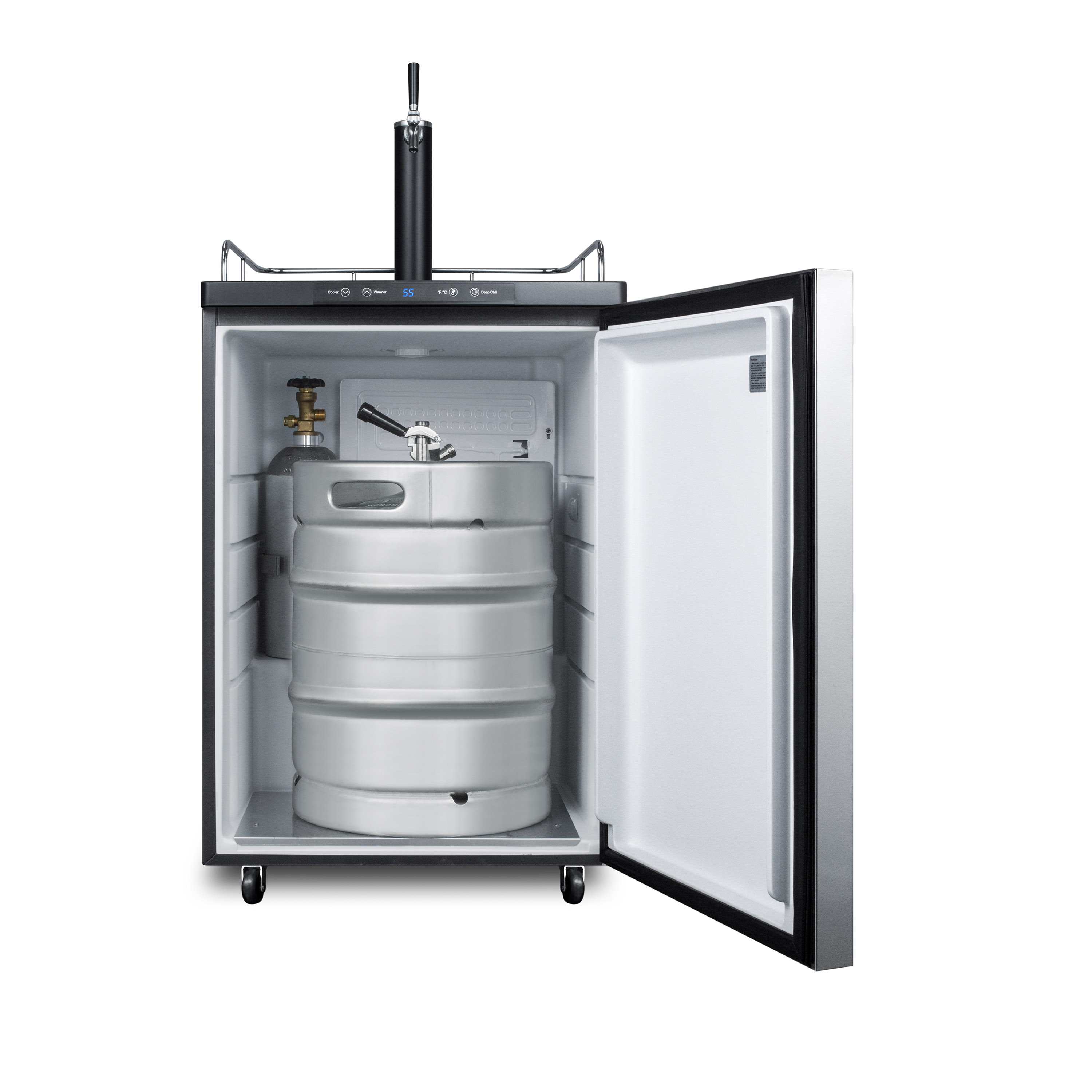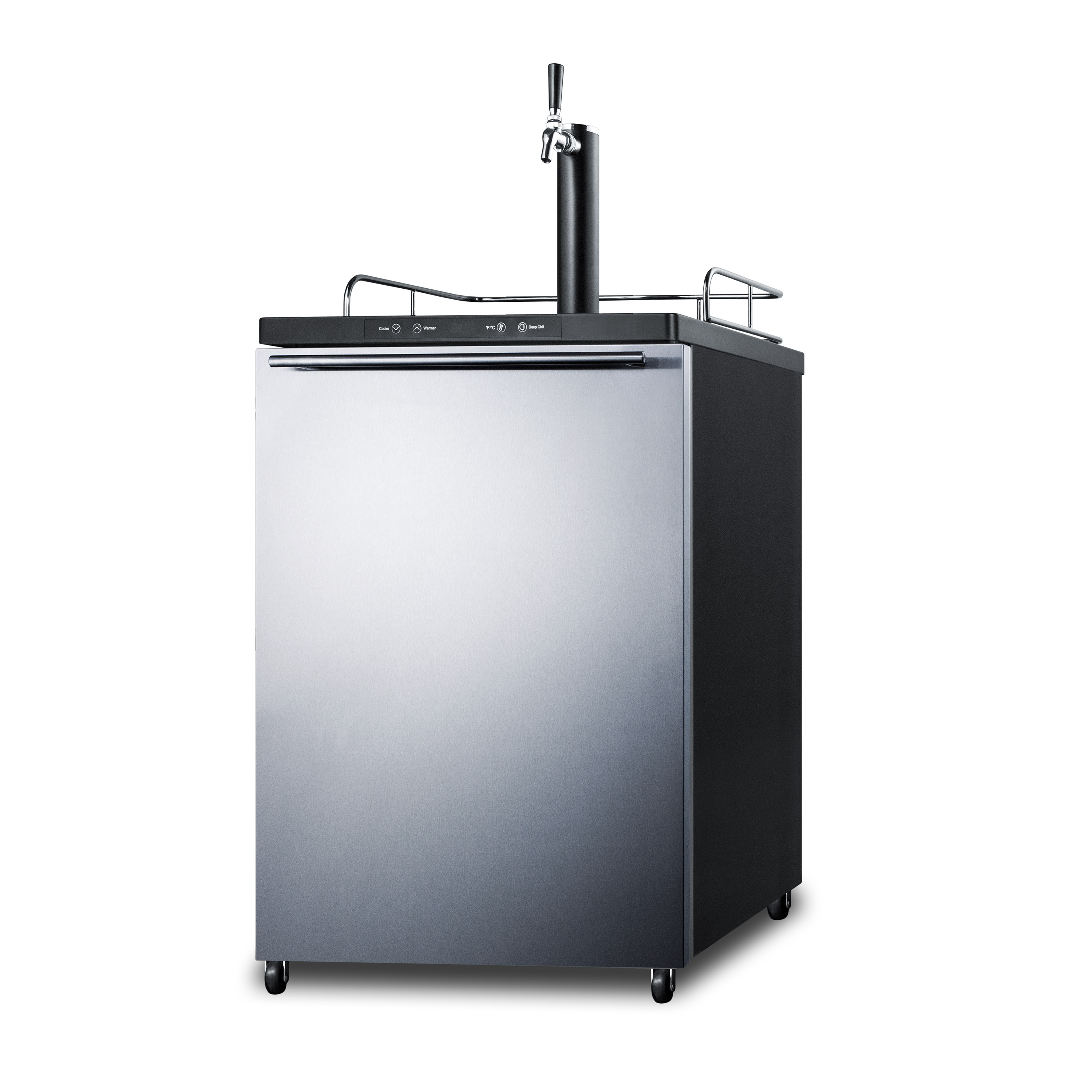 Summit Appliance offers a versatile line of full-sized freestanding beer dispensers designed for low maintenance storage in the style of your choice.The SBC635MSSHH features a large interior that can hold a full half, quarter, 1/6 or mini keg. It comes in a jet black cabinet with a matching Sankey tower. The surface includes a removable drip tray to collect spills and a chrome guard rail to help keep glasses and mugs in place. We include a set of locking casters for easy mobility. This unit features a reversible stainless steel wrapped door with a thin horizontally mounted handle for a sleek, modern look.Automatic defrost operation ensures minimum user maintenance inside the 5.6 cu.ft. interior. A digital thermostat makes it easy to manage the temperature at the touch of a button. The external digital display shows the temperature in Celsius or Fahrenheit to ensure your beer is stored exactly how you like it. Our American Sankey tap kit includes all the accessories you need for draft service, including a regulator. The floor is reinforced with a steel cover for added durability when loading kegs.This unit is designed for freestanding use. For built-in applications, see the SBC635MBISSHH.