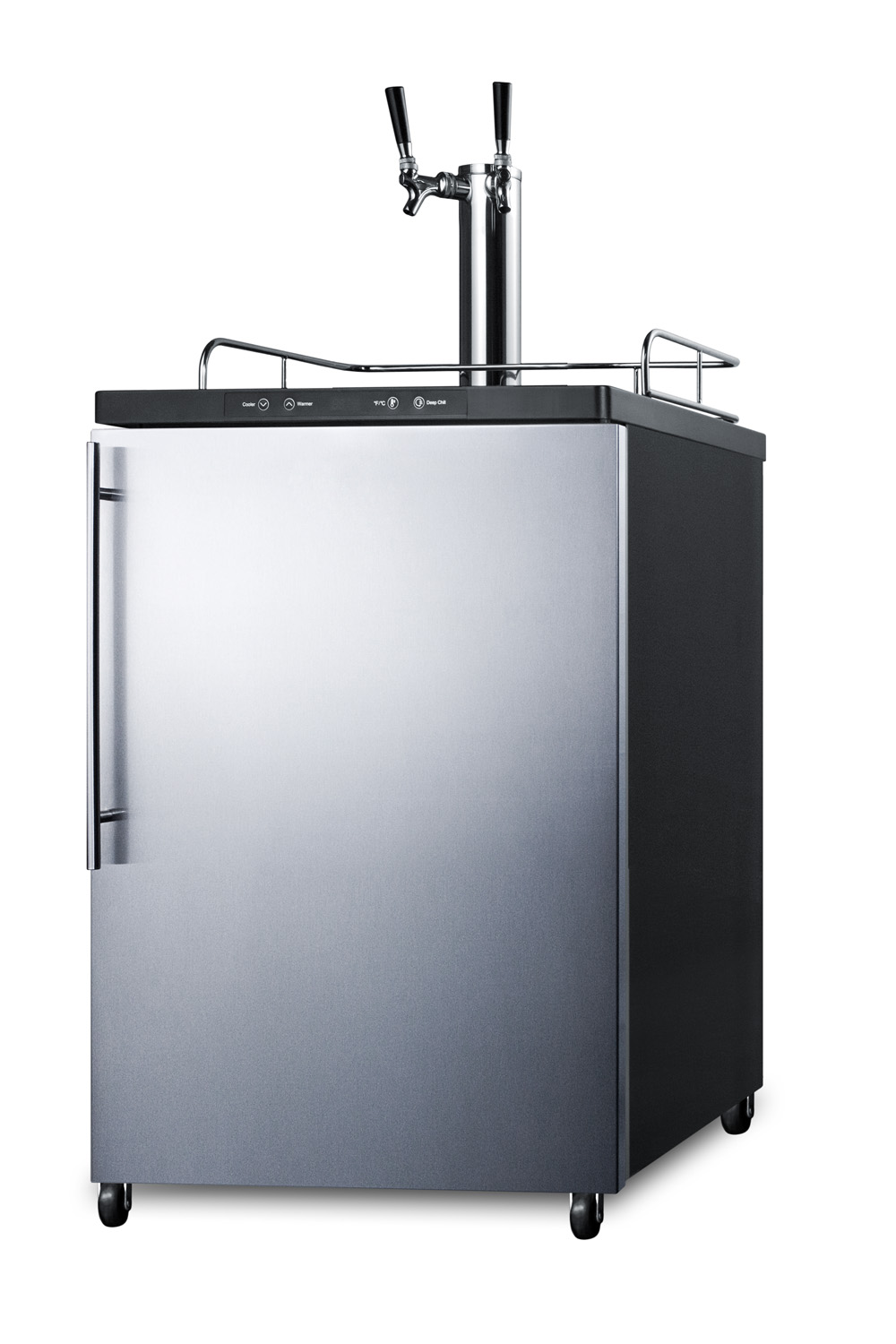 Summit Appliance offers a versatile line of full-sized freestanding beer dispensers designed for low maintenance storage in the style of your choice.The SBC635MSSHVTWIN is a full-sized beer dispenser that can store a full half barrel keg or two 1/6 barrels to best accommodate all tastes. It comes with a black cabinet and stainless steel wrapped door complete with a thin vertically mounted handle. The work surface includes an American Sankey dual tap draft tower, a removable drip tray to collect spills, and a chrome guard rail to help keep glasses and mugs in place. We include a set of locking casters for easy mobility.Automatic defrost operation ensures minimum user maintenance inside the 5.6 cu.ft. interior. A digital thermostat makes it easy to manage the temperature at the touch of a button. The external digital display shows the temperature in Celsius or Fahrenheit to ensure your beer is stored exactly how you like it. Our American Sankey dual tap kit includes all the accessories you need for draft service, including a regulator. The floor is reinforced with a steel cover for added durability when loading kegs.This unit is designed for freestanding use. For built-in applications, see the SBC635MBISSHVTWIN.