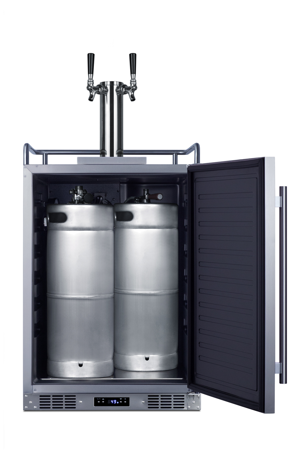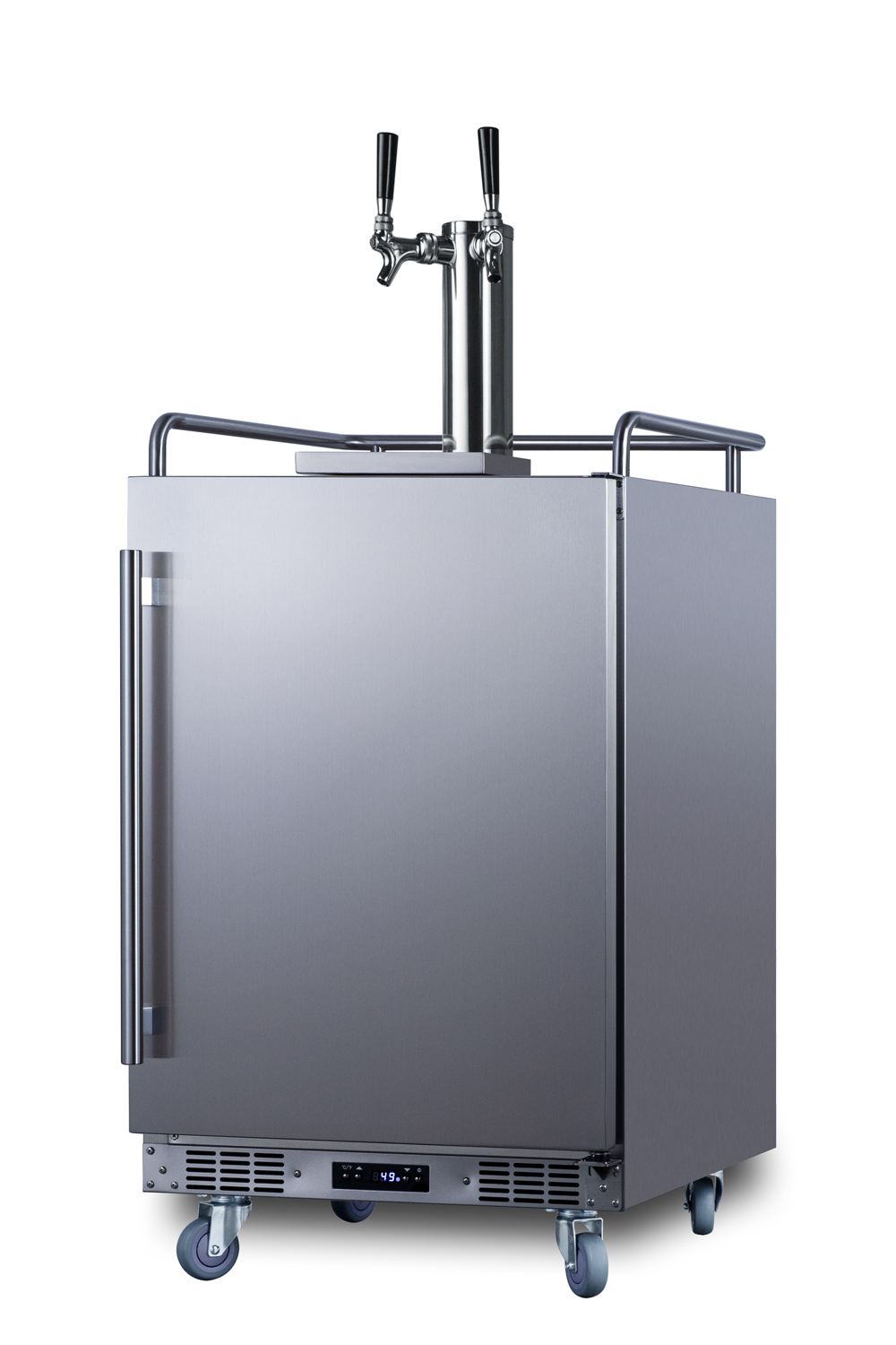 Summit manufactures a complete line of versatile built-in kegerators designed for indoor/outdoor use in commercial or residential settings. The SBC682WKDTWIN is a full-sized wine kegerator that can be used indoors or outdoors. It is ETL-S listed to NSF-7 and meets UL-471 standards for use in commercial establishments. Sized at just 24" wide, it features a weatherproof 304 grade exterior for long-lasting durability safe for use in outdoor settings. The front-breathing system allows built-in installation, while the fully finished cabinet and included caster set make for easy freestanding, portable use. This unit features a user-reversible stainless steel door with a pro style vertically mounted handle. The sealed back allows for easy cleaning of the unit. Additional features include a removable two-piece stainless steel drip tray to collect spills and a chrome guard rail to help keep glasses in place. Inside, the 5.6 cu.ft. interior can accommodate a full half or slim quarter keg, or up to three Cornelius or sixth barrel kegs. A digital thermostat lets you set easily manage the unit temperature, with a wide range between 34°F to 68°F to keep your whites or reds under proper storage conditions. We include a complete commercially listed dual tap Sankey tap system and draft tower, along with a nitrogen/CO2 tank and regulator. Two chrome shelves, with six placement options, allow the kegerator to also function as a beverage refrigerator. A tap cool system keeps your wine chilled as it goes through your tower, and a Velcro strap holds the tank in place. The interior floor is made from stainless steel to add protection when loading and removing kegs. Automatic defrost operation ensures minimal user maintenance. The Memory IC function recovers the unit's last settings in the case of a power outage or disruption. With its solid construction, user-friendly features, and attractive design, the SBC682WKDTWIN is the perfect wine dispenser for indoor or outdoor commercial settings