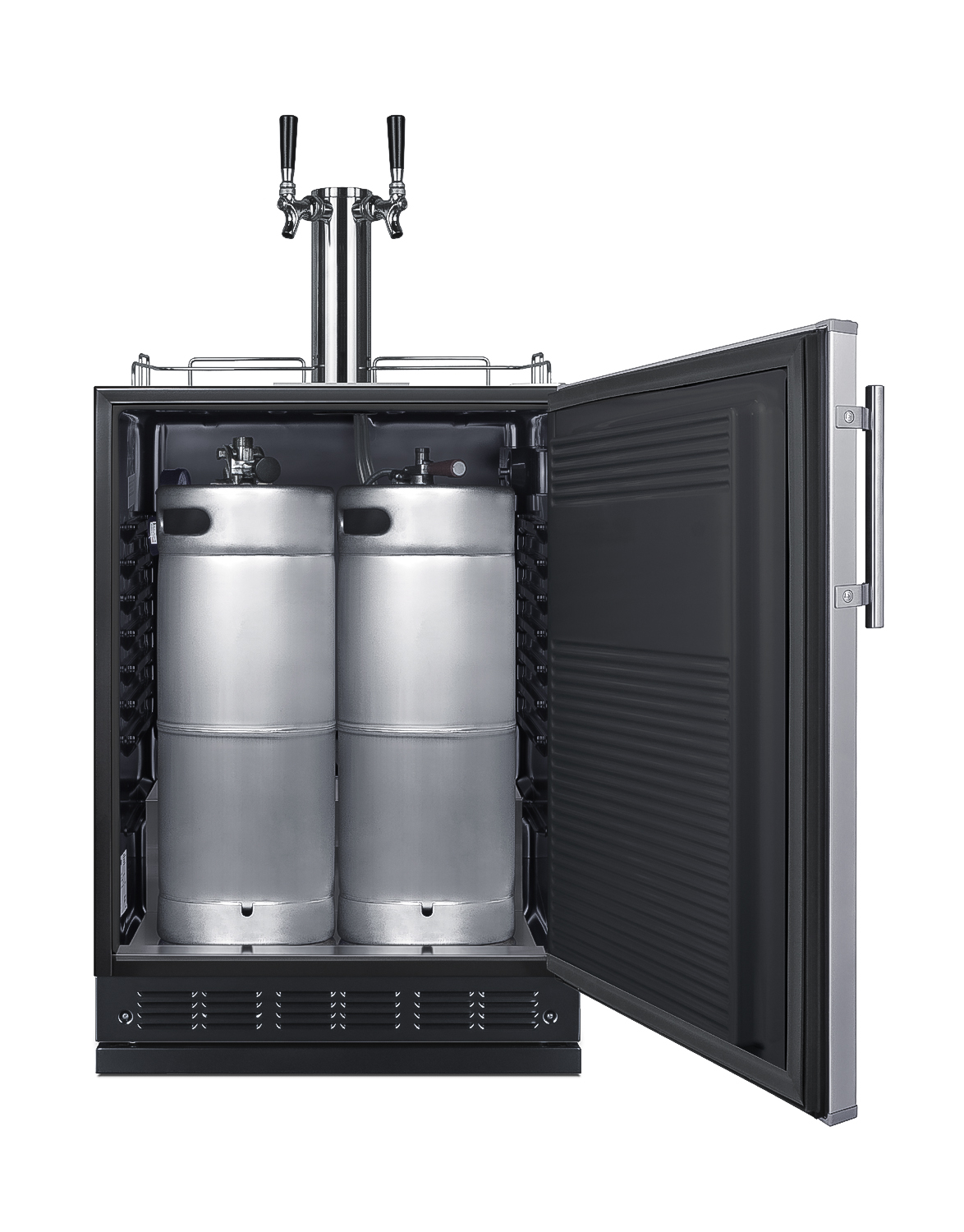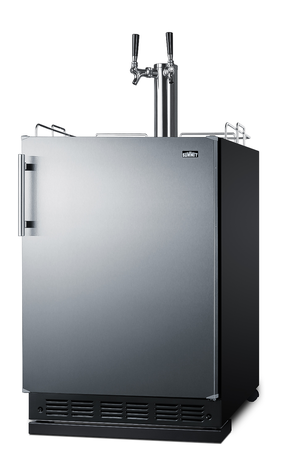 Made in Europe, Summit Commercial's SBC7 kegerator series offers refreshing convenience to any home or foodservice setting looking to serve a variety of beverages on tap.Sized with a 24" footprint, model SBC7BRS is a versatile beer dispenser that is ETL-S listed to NSF-7 standards for use in commercial environments. The design also meets residential standards for home use. It can be recessed under counters or used freestanding. Adjustable legs allow you to set the height between 33 1/2" and 34 1/2" for the perfect fit. We include a black steel leg shield for optional use if you find there is too much space between the front and floor when the unit is set at its taller height, as well as a set of casters (two locking) for optional mobility if preferred. The user-reversible stainless steel door offers an elegant look for any kitchen, with a special coating that makes it easy to wipe off the surface for a fingerprint-resistant front. The stainless steel handle is side mounted for an easy grip and attractive look. This kegerator ships with our complete commercial grade stainless steel twin tap kit. The tower includes two faucets to serve beer from two 1/6 (sixtel) kegs. We also include a CO2 tank, regulator, and all of the equipment you need to serve beer on tap. Inside, the SBC7BRS features a black interior liner and stainless steel floor for added protection when loading kegs. The interior light comes with an on/off rocker switch located behind the dial thermostat. Classic mechanical controls ensure an intuitive, trouble-free performance without any internal boards or chips. Automatic defrost reduces user maintenance and our signature cold wall design creates an efficient, reliable cooling system. We include a set of adjustable glass shelves and one scalloped bottle rack for easy storage if using the interior as a standard beverage refrigerator. In addition to this dual tap kegerator, the SBC7 series also includes choices that dispense wine and cold brew coffee. Summi