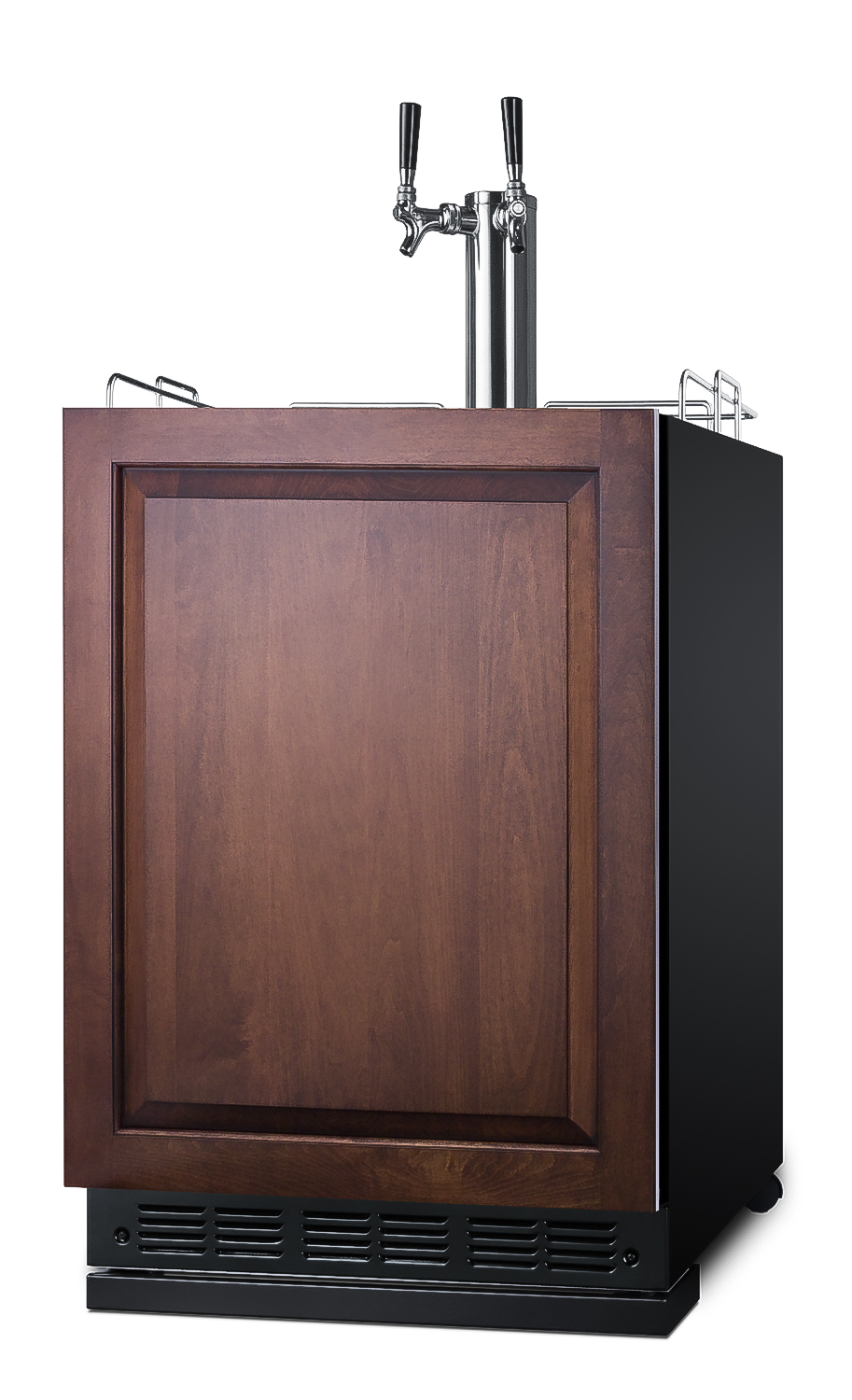 Made in Europe, Summit Commercial's SBC7 kegerator series offers refreshing convenience to any home or foodservice setting looking to serve a variety of beverages on tap.Sized with a 24" footprint, model SBC7BRSIF is a versatile beer dispenser that is ETL-S listed to NSF-7 standards for use in commercial environments. The design also meets residential standards for home use. It can be recessed under counters or used freestanding. Adjustable legs allow you to set the height between 33 1/2" and 34 1/2" for the perfect fit. We include a black steel leg shield for optional use if you find there is too much space between the front and floor when the unit is set at its taller height, as well as a set of casters (two locking) for optional mobility if preferred. The door features an integrated stainless steel exterior frame designed to accept overlay panels, allowing you to create a custom look that can seamlessly blend into your kitchen (panel size: 23 5/16" W x 28 1/4" H and at least 3/4" thick). Users provide their own handle to complete the look. This kegerator ships with our complete commercial grade stainless steel twin tap kit. The tower includes two faucets to serve beer from two 1/6 (sixtel) kegs. We also include a CO2 tank, regulator, and all of the equipment you need to serve beer on tap. Inside, the SBC7BRSIF features a black interior liner and stainless steel floor for added protection when loading kegs. The interior light comes with an on/off rocker switch located behind the dial thermostat. Classic mechanical controls ensure an intuitive, trouble-free performance without any internal boards or chips. Automatic defrost reduces user maintenance and our signature cold wall design creates an efficient, reliable cooling system. We include a set of adjustable glass shelves and one scalloped bottle rack for easy storage if using the interior as a standard beverage refrigerator. In addition to this dual tap kegerator, the SBC7 series also includes choices that dispen