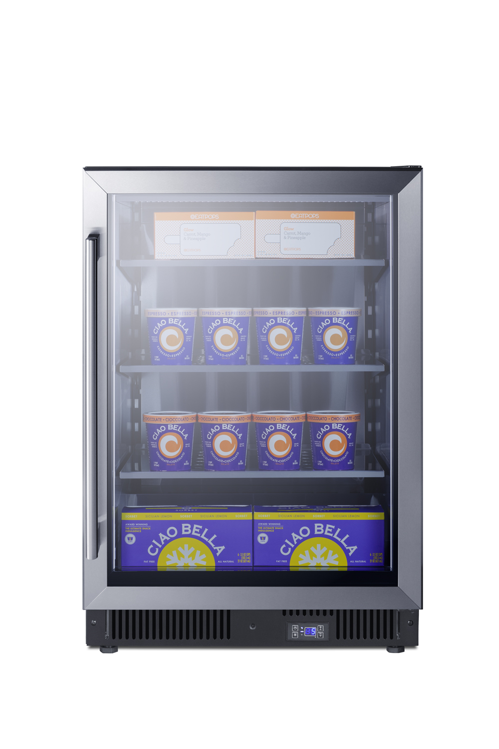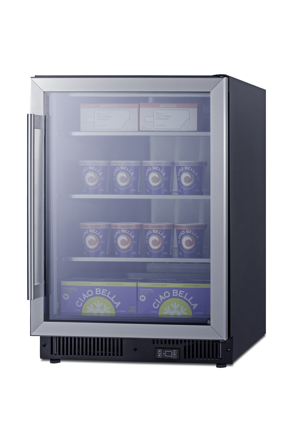 Summit's commercial series of undercounter freezers offers an attractive display for maximizing impulse sales and keeping products under reliable cold storage conditions.The SCF475 is a frost-free freezer with an easy-fitting 24" footprint and a front-breathing design ideal for built-in installation under counters. The stainless steel trimmed door features triple-pane tempered glass that is vacuum insulated with a low-e coating, helping to improve energy efficiency and ensure items are on full display. LED lighting in the side walls helps to provide attractive illumination. For increased security, the unit features a factory-installed lock in the kickplate. The digital thermostat is externally located for easy temperature management. The door is user-reversible to best suit your space, with a pro style handle included. Inside, the SCF475 features 5.14 cu.ft of storage space and stainless steel construction for improved durability and sanitation. A commercial-grade cantilevered shelving system allows flexible storage. Three perforated steel shelves are designed to hold up to heavy duty commercial use and ensure proper cold air circulation. This freezer includes a SuperFreeze setting, which is great for freezing newly loaded foods quickly. Additional features include an open door alarm, high-temperature alarm, and Sabbath mode setting that lets you disable some of the electrical elements during periods of observance.The SCF475 is ETL-S listed to NSF-7 for use in commercial settings. With its deluxe style, user-friendly features, and low maintenance frost-free operating system, this freezer offers premium value for bars, restaurants, hotel marketplaces, and other commercial environments. Create a matching set by pairing this with the SCR610BL, our 24" wide stainless steel beverage center.