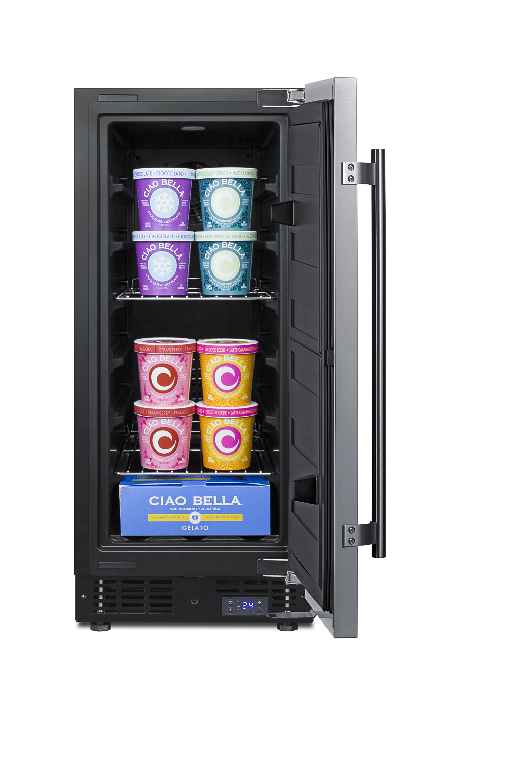 SUMMIT brings true convenience to small kitchen spaces with the SCFF1533BSS, a 15" wide fully frost-free all-freezer.The SCFF1533BSS is front-breathing for built-in use under counters, but also features a fully finished black cabinet to allow freestanding use. The user reversible door is fully wrapped in stainless steel and a factory installed lock offers keyed security. This unit includes our fully articulating European style hinge design. Inside, the SCFF1533BSS is fully frost-free to minimize user maintenance, with slide-out chrome shelves that can be adjusted to accommodate a variety of items. Recessed LED lighting provides an elegant and efficient display inside the 2.4 cu.ft. interior. This unit includes a digital thermostat in the kickplate for easy and intuitive temperature control.With a uniquely slim size and user-friendly features, the SCFF1533BSS is the ideal freezer for space-challenged homes. This unit can be paired with the matching FF1532BSS all-refrigerator as a side-by-side set or combined with our Stack15. It is ETL-S listed to NSF-7 commercial standards and meets UL-471.