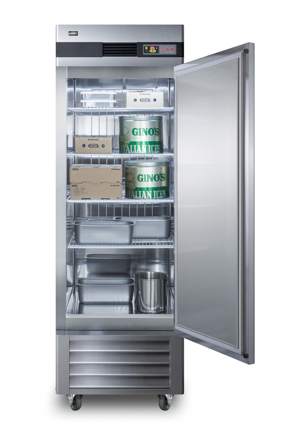 Summit Commercial's line of reach-in refrigeration features durable construction built to NSF-7 commercial standards.Made in South Korea, the SCFF237 is a commercial all-freezer with a complete stainless steel cabinet. The stainless steel door features a self-closing design to help protect stored contents in busy commercial settings where customers may not take the time to make sure the door is closed. It will remain open when pushed to 90º, making it easier to load and unload the unit. The sealed back design helps to simplify cleanup. This unit features a factory-installed lock located towards the top of the door for convenient security. We include a set of locking casters for optional installation.The SCFF237 features a large 23 cu.ft. interior constructed from stainless steel for easy cleanup and lasting durability. The cantilevered shelving system allows you to adjust the four vinyl-coated shelves to virtually any position, making it easy to accommodate any sized item. This unit is designed to fit common commercial baking trays. The LED lighting offers an energy efficient display when the door is opened. This unit utilizes adjustable cycle defrost operation to avoid temperature spikes, with a top-mounted forced air cooling system to ensure rapid temperature recovery.To ensure optimum storage conditions, the SCFF237 is equipped with a microprocessor temperature controller that makes it easy for staff to adjust the temperature. The large digital LED readout displays the current and high/low temperatures in Celsius or Fahrenheit. An audible and visual temperature alarm sounds if the unit rises or falls above a user-set range. Additional alarms include a power failure alert, door open alarm, and a condenser cleaning reminder. Designed with hydrocarbon refrigerant, the SCFF237 provides an energy efficient solution to large capacity storage. It is ETL-S listed to NSF-7 commercial standards. For a matching refrigerator, see the SCRR232.