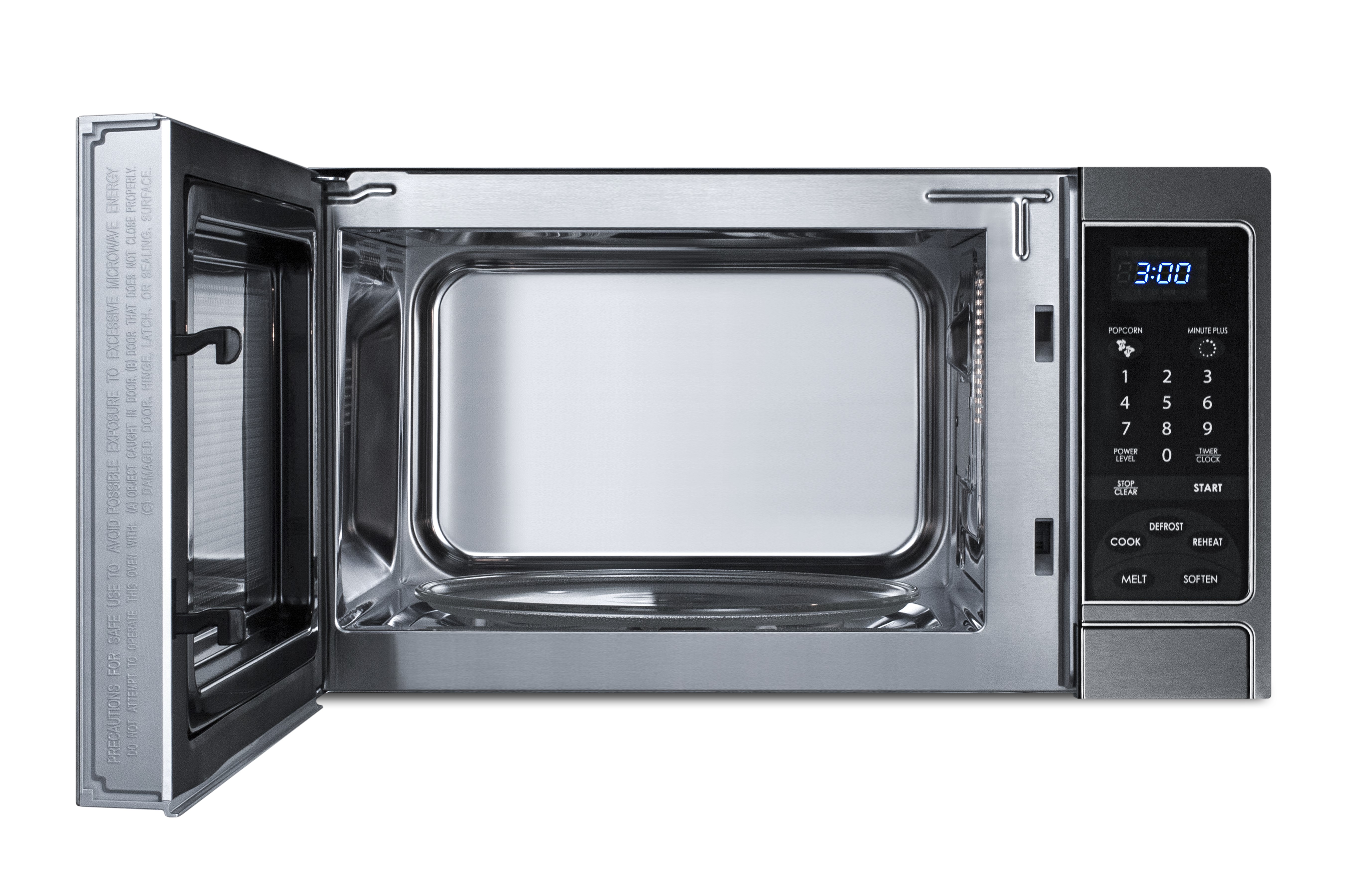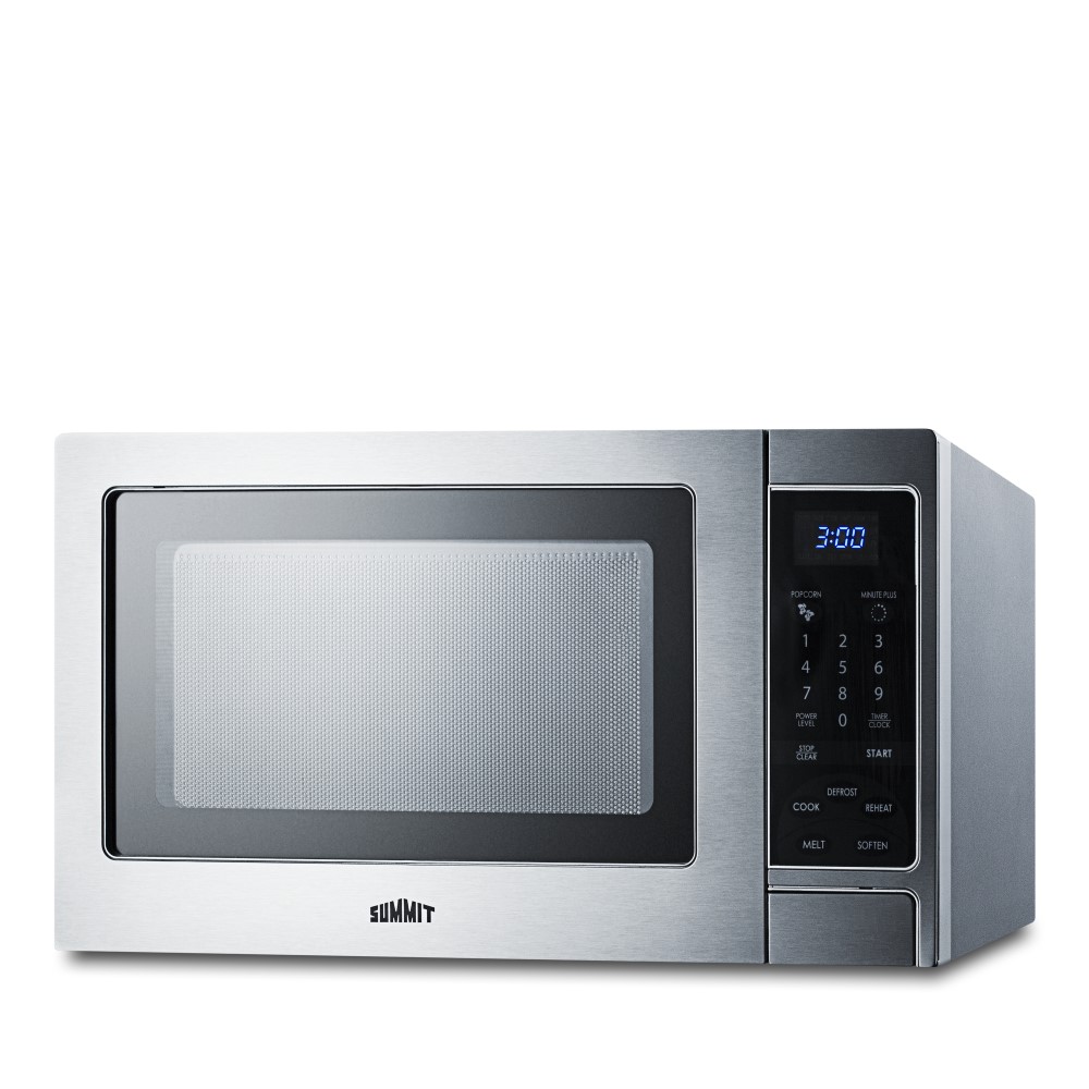 SUMMIT SCM853 brings modern style to the classic microwave oven.This 900W unit comes with a brushed stainless steel exterior and a polished stainless steel interior for easy cleanup. The digital controls offer a variety of cooking functions, with options for popcorn, reheating, defrosting, melting, and softening butter. Multiple power levels allow you to program two cooking steps and a child lock ensures added safety. This model includes a glass turntable and a push-to-open button.With an attractive design and full cooking convenience, the SCM853 is the ideal compact microwave for small kitchens.