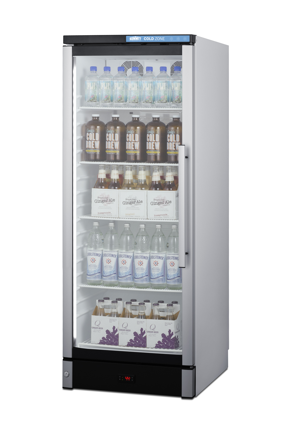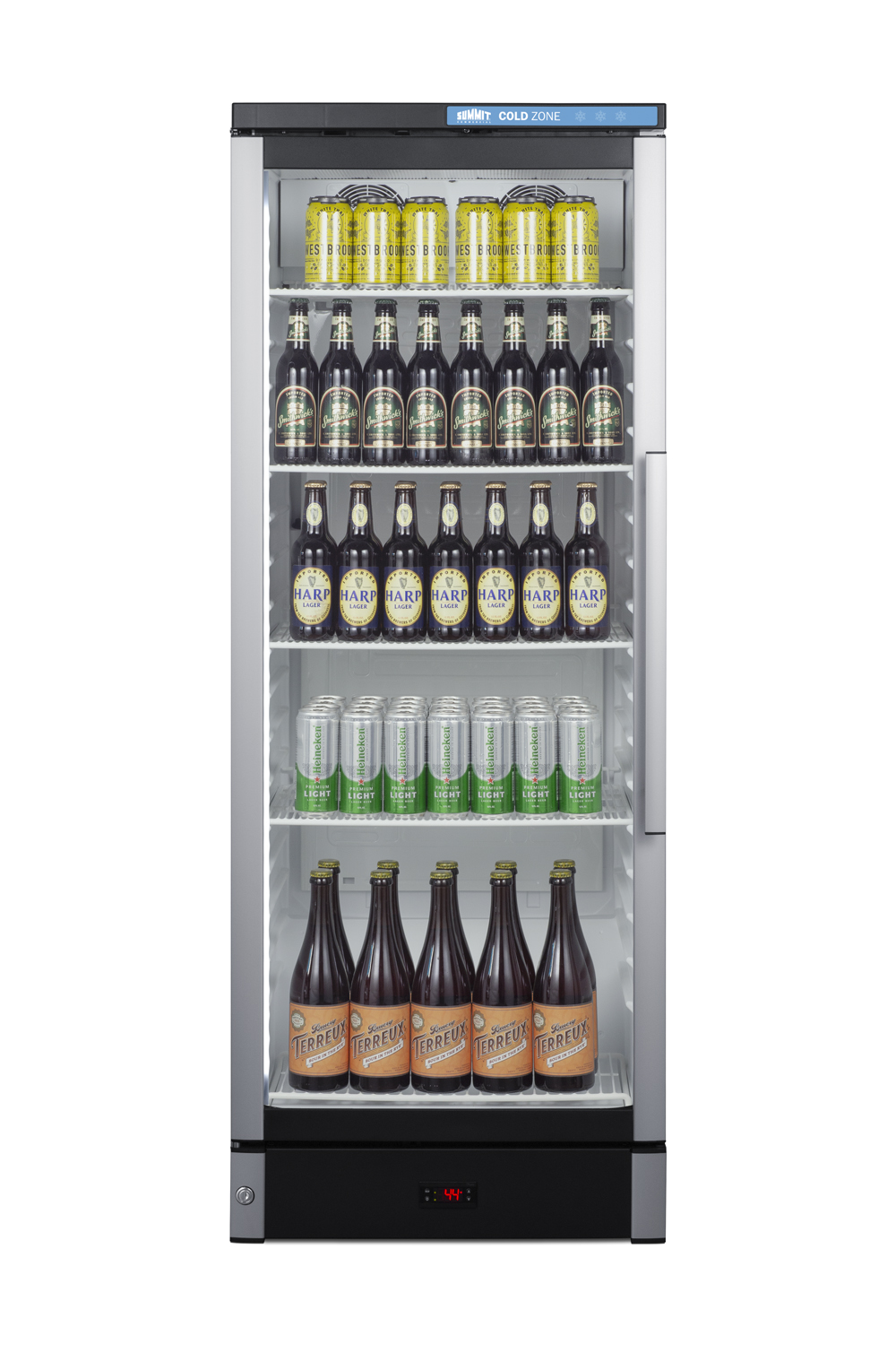 Summit Commercial manufactures a full selection of slim-fitting European beverage centers designed for durable service, convenient use, and attractive presentation.Made in Denmark, model SCR1154LHD is a 24" wide 9.9 cu.ft. upright beverage merchandiser sized with a space-saving 25.25" depth. The double pane tempered glass door includes built-in LED lighting to create an attractive and energy efficient presentation of stored items, helping to promote impulse buys. A factory-installed lock allows users to secure the door as needed. Digital controls ensure easy and intuitive operation. This unit ships with a left hand door swing.Inside, the SCR1154LHD features a bright white interior for full product visibility. Four adjustable wire shelves let you rearrange your storage to accommodate a variety of sizes. Each shelf has a generous 79 lb. storage tolerance. We include one additional shelf to raise items off the floor. The automatic defrost system with a cold wall interior helps to keep beverages cold and minimize user maintenance, while powerful fan-forced cooling helps to evenly distribute airflow and promote fast temperature recovery in busy commercial environments. The SCR1154LHD is ETL-S listed to NSF-7 commercial standards and utilizes environmentally-friendly hydrocarbon refrigerant to comply with CARB guidelines. For a slightly taller version of this unit, see the SCR1301LHD.