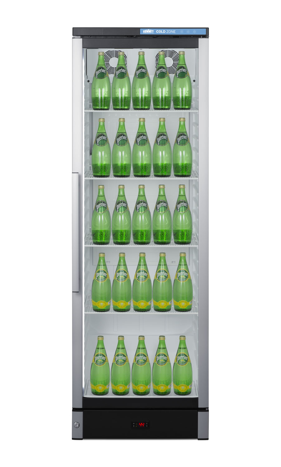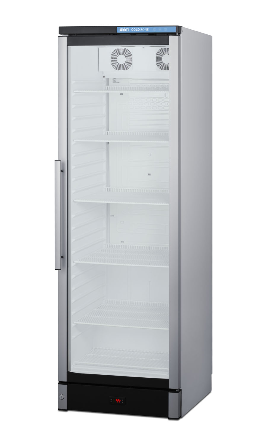Summit Commercial manufactures a full selection of slim-fitting European beverage centers designed for durable service, convenient use, and attractive presentation.Made in Denmark, model SCR1301 is a 24" wide 12.4 cu.ft. upright beverage merchandiser sized with a space-saving 25 1/4" depth. The double pane tempered glass door includes built-in LED lighting to create an attractive and energy efficient presentation of stored items, helping to promote impulse buys. A factory-installed lock allows users to secure the door as needed. Digital controls ensure easy and intuitive operation. Inside, the SCR1301 features a bright white interior for full product visibility. Five adjustable wire shelves let you rearrange your storage to accommodate a variety of sizes. Each shelf has a generous 79 lb. storage tolerance. We include one additional shelf to raise items off the floor. The automatic defrost system with a cold wall interior helps to keep beverages cold and minimize user maintenance, while powerful fan-forced cooling helps to evenly distribute airflow and promote fast temperature recovery in busy commercial environments. The SCR1301 is ETL-S listed to NSF-7 commercial standards and utilizes environmentally-friendly hydrocarbon refrigerant to comply with CARB guidelines.NOTE: this unit ships with a right hand door swing. For a left hand version by special order, add option "LHD" or see model SCR1301LHD.