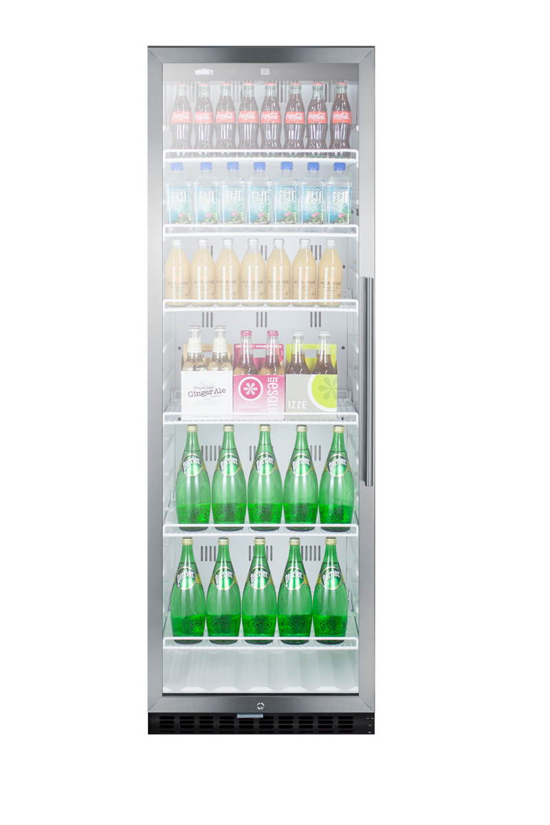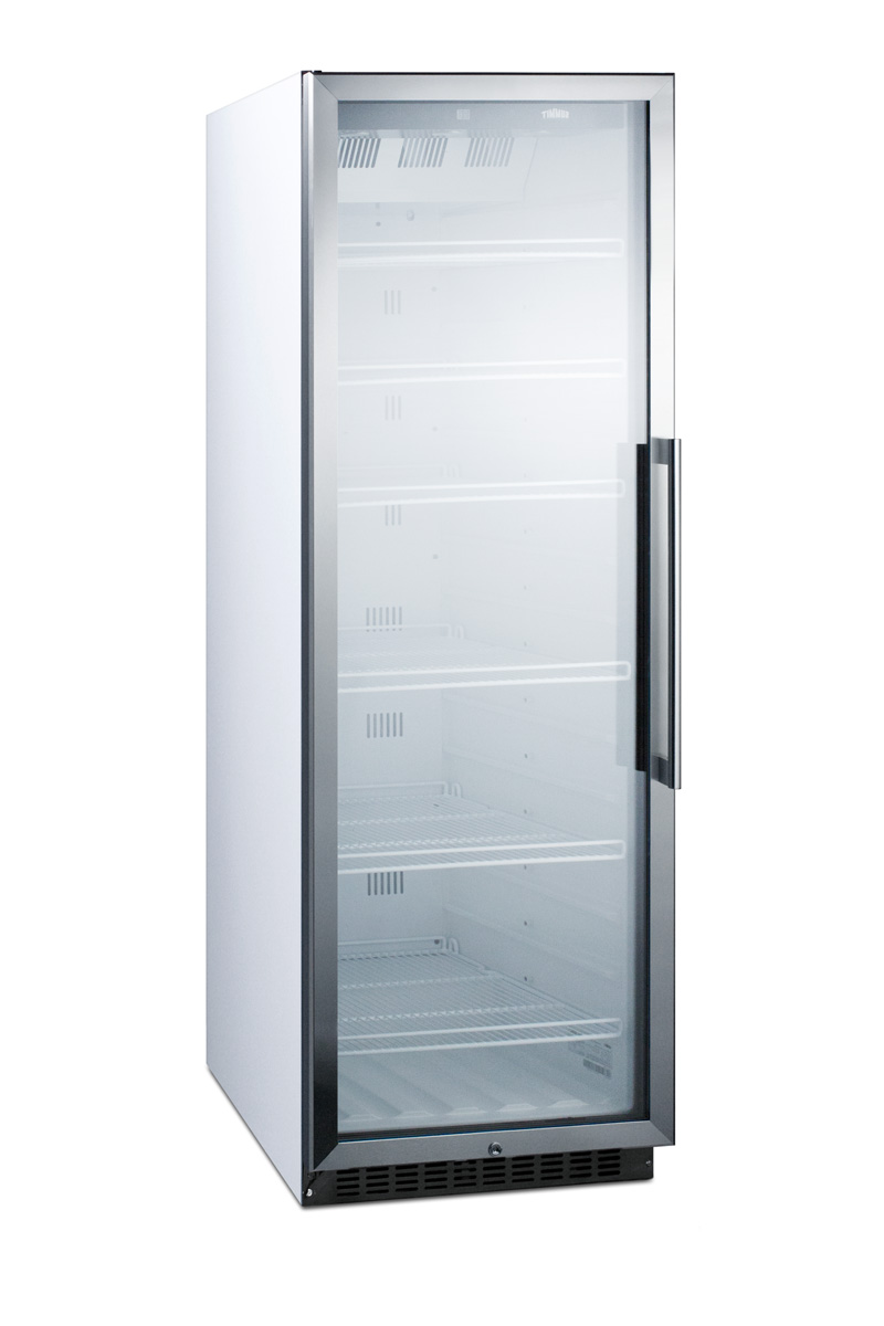 SUMMIT's commercially approved beverage merchandisers are designed for durable service, convenient use, and attractive presentation.SUMMIT SCR1400WLH offers 12.6 cu.ft. of storage space in a slim-fitting footprint just under 24". Bottles and cans can be stored on six heavy duty wire shelves, with fifteen glide options to accommodate different sizes. LED lighting offers full illumination of stored products and a digital thermostat makes temperature control as simple as touching a button. The readout can be viewed in Celsius or Fahrenheit.The frost-free SCR1400WLH features a tempered heat-safe glass door trimmed in stainless steel, with a keyed lock for added security. The stainless steel trimmed glass door includes a pro style handle to complete the modern look, with a self-closing mechanism to ensure items aren't accidentally exposed to warm air. This unit has a front-breathing cooling system that allows built-in installation, and a fully finished exterior that also enables freestanding use. This unit has a left hand door swing. For a right hand version, see the SCR1400W. This model has a white cabinet and a right angle plug for an easier fit. It meets UL-471 commercial standards and is ETL-S listed to NSF standards for use in any commercial foodservice establishment. For this same unit with a stainless steel exterior, see the SCR1400WLHCSS.NOTE: This is an indoor refrigerator and is not designed for use in the outdoors.