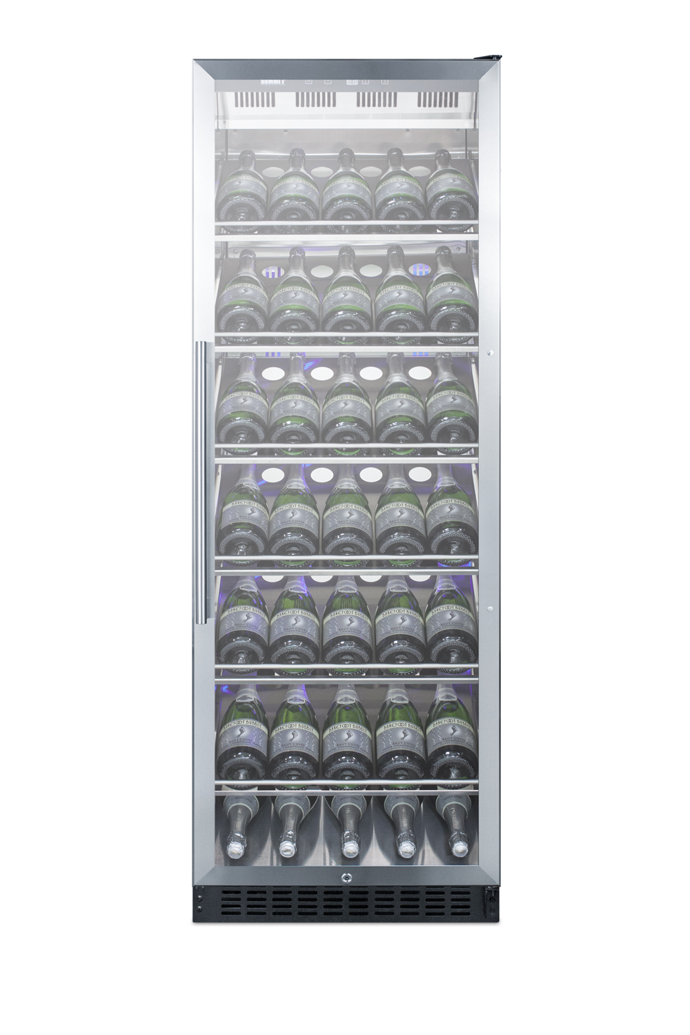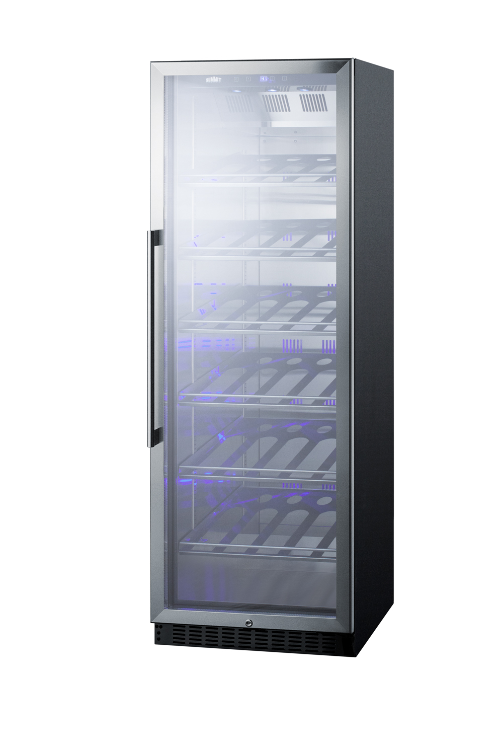 Summit Commercial offers a unique selection of wine cellars designed for optimum storage and bottle presentation.The SCR1401CH is an upright wine cellar built to meet NSF-7 commercial standards. The slim 24 inch footprint takes up minimum floor space, while the large 12.6 cu.ft. The self-closing stainless steel trimmed door includes a pro style handle and factory-installed lock for added security. This model comes with a right hand door swing. For a left hand version, see the SCR1401LHCH. This unit has a front-breathing cooling system that allows built-in installation, and a fully finished exterior that also enables freestanding use.Inside, the SC1401CH includes stainless steel shelving specially designed to hold champagne and sparkling wine bottles at a slight angle, providing a full display of the label. The interior walls and floor are constructed from stainless steel for lasting durability in busy commercial settings. This unit is illuminated through the rear walls with efficient LED lighting in a striking blue hue. The digital control panel offers a wide 36 to 68ºF temperature range that allows you to program the optimum settings for red, white, or sparkling wine. Additional features include an audible high temperature alarm, open door alarm, temperature memory function, and sabbath mode setting. The SCR1401CH comes with a fully finished jet black cabinet. Additional choices are available in stainless steel, as well as alternate sizes. Browse our website to explore our full lineup of commercially approved wine cellars.