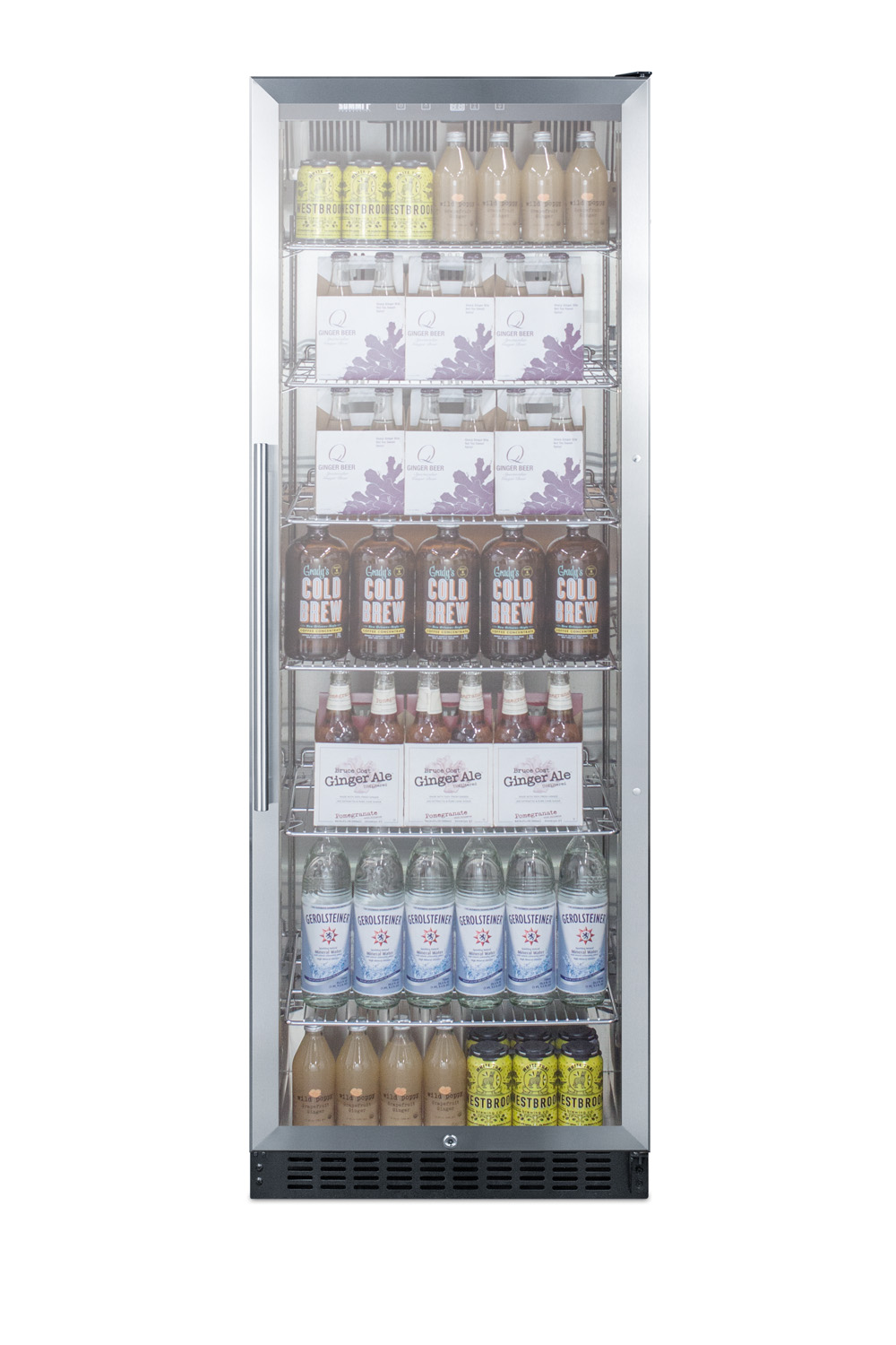 Summit's commercially approved beverage merchandisers are designed for durable service, convenient use, and attractive presentation.The SCR1401CSS is an upright beverage center conveniently sized with a slim 24 inch footprint. The stainless steel trimmed glass door provides a full view of storage down to the floor, with recessed LED lighting to ensure an attractive and efficient presentation. The door comes in a right hand door swing and features a self-closing design to help protect stored items in commercial settings where customers may not take the time to ensure a tight seal. A factory installed lock offers additional security. This unit has a front-breathing cooling system that allows built-in installation, and a fully finished 304 grade stainless steel wrapped exterior cabinet that also enables freestanding use.Inside, the SCR1401CSS utilizes frost-free operation for minimum user maintenance. The interior walls are made from stainless steel for improved durability and sanitation. The cantilevered shelving system allows you to easily adjust your storage to accommodate virtually any size. The digital control panel is conveniently located towards the top, allowing staff to adjust the temperature without bending to the floor. The readout can be viewed in Celsius or Fahrenheit. Additional features include an audible high temperature alarm, open door alarm, temperature memory function, and sabbath mode setting. The SCR1401CSS is ETL-S listed to NSF-7 standards for use in commercial settings. Similar choices are available in lower heights for more space-challenged areas. Browse Summit's commercial product line for more.