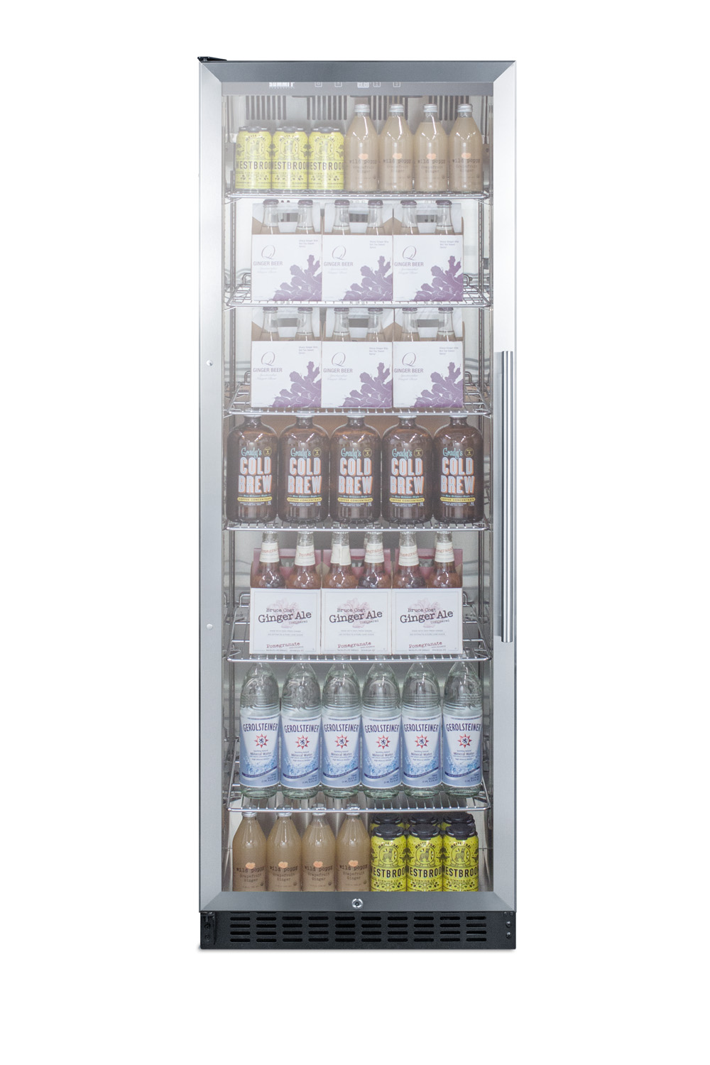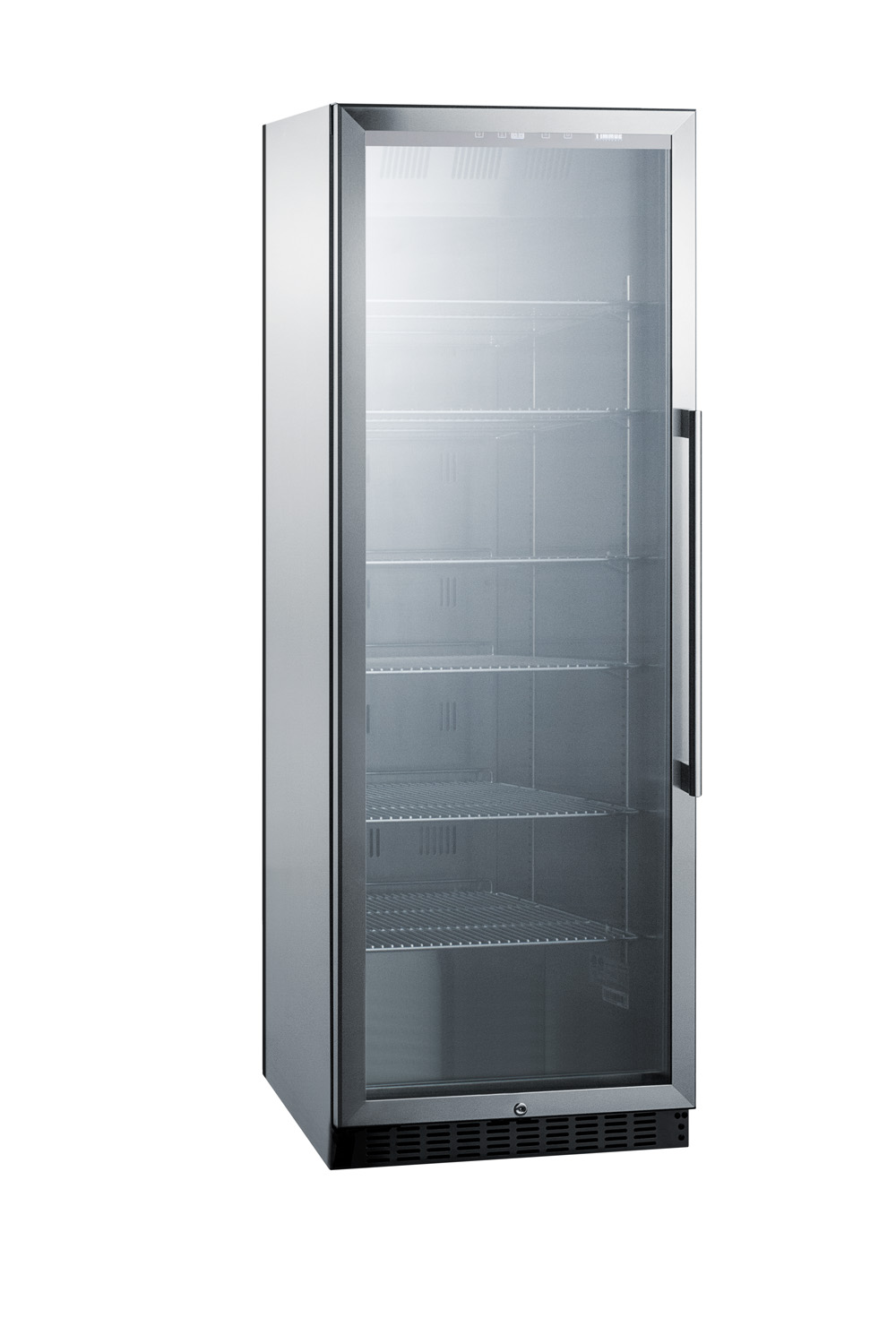 Summit's commercially approved beverage merchandisers are designed for durable service, convenient use, and attractive presentation.The SCR1401LHCSS is an upright beverage center conveniently sized with a slim 24 inch footprint. The stainless steel trimmed glass door provides a full view of storage down to the floor, with recessed LED lighting to ensure an attractive and efficient presentation. The door comes in a left hand door swing and features a self-closing design to help protect stored items in commercial settings where customers may not take the time to ensure a tight seal. A factory installed lock offers additional security. This unit has a front-breathing cooling system that allows built-in installation, and a fully finished stainless steel wrapped cabinet that also enables freestanding use.Inside, the SCR1401LHCSS utilizes frost-free operation for minimum user maintenance. The interior walls are made from stainless steel for improved durability and sanitation. The cantilevered shelving system allows you to easily adjust your storage to accommodate virtually any size. The digital control panel is conveniently located towards the top, allowing staff to adjust the temperature without bending to the floor. The readout can be viewed in Celsius or Fahrenheit. Additional features include an audible high temperature alarm, open door alarm, temperature memory function, and sabbath mode setting. The SCR1401LHCSS is ETL-S listed to NSF-7 standards for use in commercial settings. Similar choices are available in lower heights for more space-challenged areas. Browse Summit's commercial product line for more.