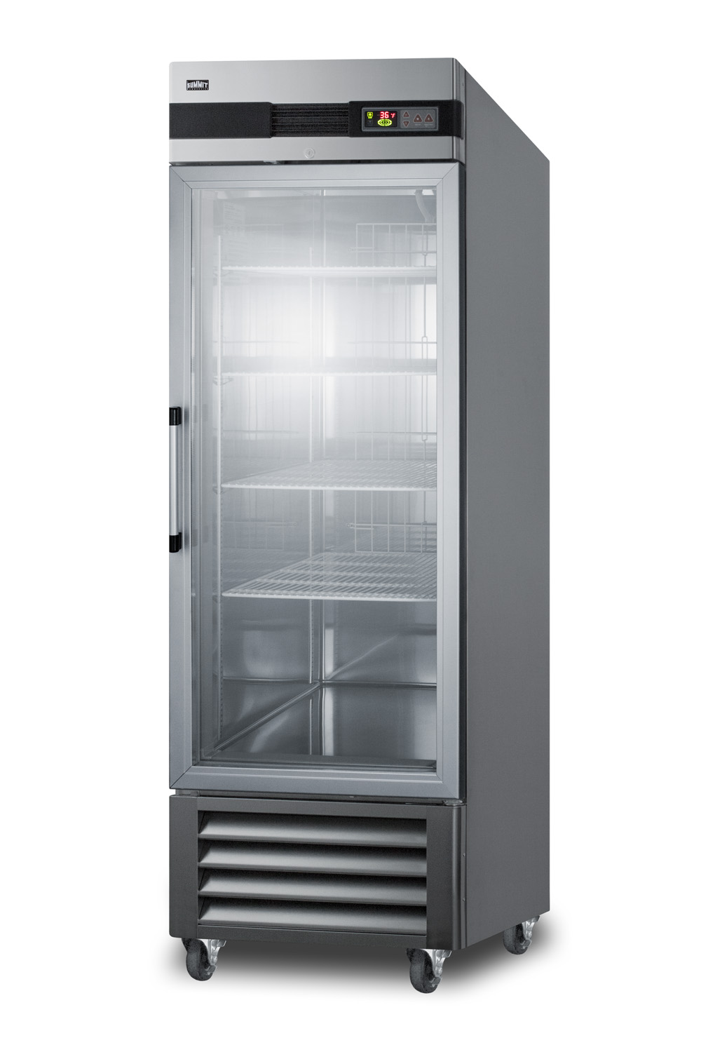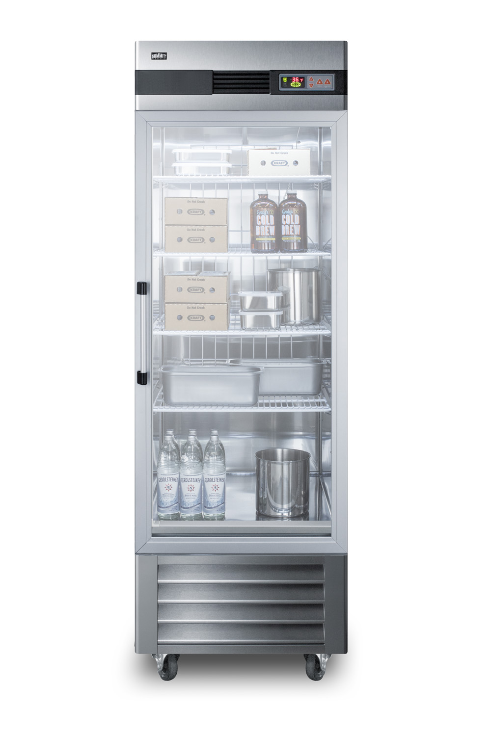 Summit Commercial's line of reach-in refrigeration features durable construction built to NSF-7 commercial standards.Made in South Korea, the SCR23SSG is a commercial all-refrigerator with a complete stainless steel cabinet and double pane tempered glass door for a full product display. The door is self-closing design to help protect stored contents in busy commercial settings where customers may not take the time to make sure the door is closed. It will remain open when pushed to 90º, making it easier to load and unload the unit. The sealed back design helps to simplify cleanup. This unit features a factory-installed lock located towards the top of the door for convenient security. We include a set of locking casters for optional installation.The SCR23SSG features a large 23 cu.ft. interior constructed from stainless steel for easy cleanup and lasting durability. The cantilevered shelving system allows you to adjust the four vinyl-coated shelves to virtually any position, making it easy to accommodate any sized item. This unit is designed to fit common commercial baking trays. The LED lighting offers an energy efficient display when the door is opened. It utilizes adjustable cycle defrost operation to avoid temperature spikes, with a top-mounted forced air cooling system to ensure rapid temperature recovery.To ensure optimum storage conditions, the SCR23SSG is equipped with a microprocessor temperature controller that makes it easy for staff to adjust the temperature. The large digital LED readout displays the current and high/low temperatures in Celsius or Fahrenheit. An audible and visual temperature alarm sounds if the unit rises or falls above a user-set rage. Additional alarms include a power failure alert, door open alarm, and a condenser cleaning reminder. Designed with hydrocarbon refrigerant, the SCR23SSG provides an energy efficient solution to large capacity storage. It is ETL-S listed to NSF-7 commercial standards. For a matching solid door frost-free f