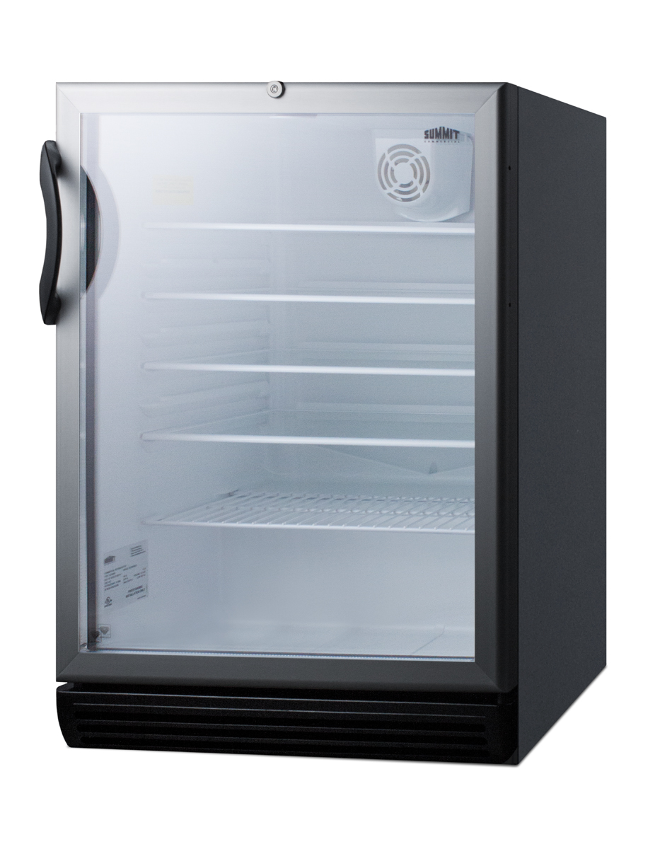 SUMMIT COMMERCIAL's freestanding SCR600BGLADA Series features 32" high beverage refrigerators designed and manufactured in Europe for quality storage and presentation in commercial establishments following ADA guidelines for lower counter height.Sized just under 24" wide and deep, the SCR600BGLADA offers a generous 5.5 cu.ft. of storage capacity. At 32" high, this unit is perfect for applications with lower ADA compliant counters. The user-reversible door features double pane tempered glass for added protection, with a brushed aluminum finish on the frame. The factory-installed front lock is located towards the top of the door for easier access. This unit comes with a black cabinet finish and is designed for freestanding use. For a built-in version, see the SCR600BGLBIADA.Inside, the SCR600BGLADA includes four adjustable glass shelves for spill-proof storage and a half-sized wire shelf ideal for holding bottles in place. Automatic defrost ensures minimum user maintenance and a dial thermostat makes it simple to manage the temperature. This unit features an interior light operated with an ON/OFF rocker switch and a white interior finish to ensure optimum product visibility. Our unique "hidden" evaporator is located in the rear wall to help protect the unit's system and maximize shelf space. An internal fan helps to ensure the interior is more evenly cooled from top to bottom.The SCR600BGLADA is ETL-S listed to NSF-7 commercial standards. Additional handle styles are available.