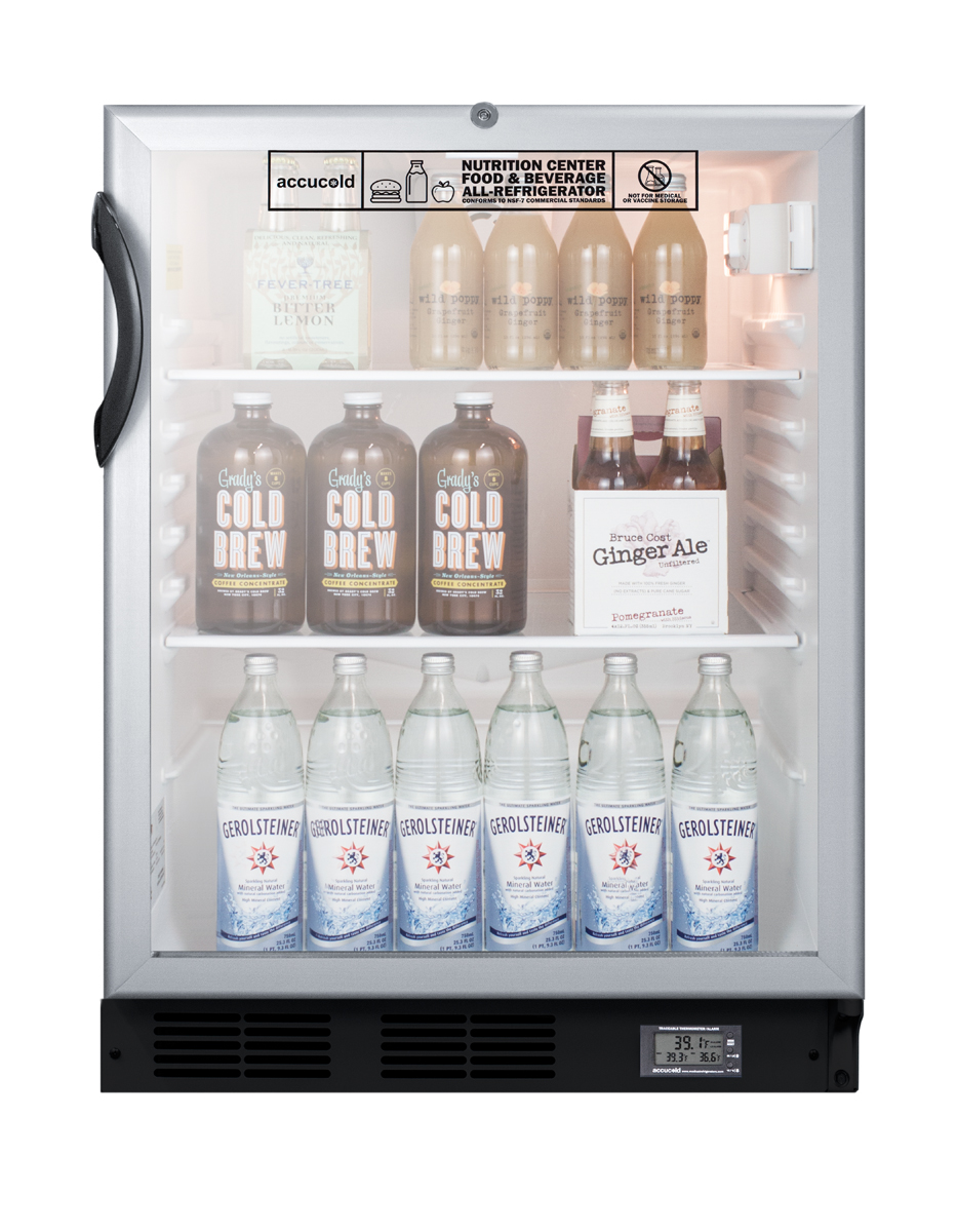 Accucold's Nutrition Center Series features commercially approved refrigerators and freezers specifically designed for the storage of sealed food and beverages in a variety of facilities, including break rooms, waiting areas, nurses' stations, and more.Made in Europe, the SCR600BGLBINZADA is a display refrigerator sized with a convenient 24" footprint. Sized at 32" high, it can be used built-in or freestanding under counters in ADA compliant settings. This unit is ETL-S listed to NSF-7 standards for the storage of sealed food and beverages. The kickplate features a factory installed digital thermometer that provides a continuous external display of the current and minimum/maximum temperature to the nearest tenth of a degree, making it easier for staff to monitor and record the temperature as needed. This device includes a built-in audible alarm that will sound if the unit rises or falls out of the set temperature range. The temperature probe is encased in a glycol-filled bottle to best simulate the temperature of stored contents. All temperature display devices are calibrated to NIST standards in our ISO/IEC 17025:2017 laboratory and include a certificate of calibration.Inside, the SCR600BGLBINZADA utilizes low maintenance automatic defrost operation with a hidden evaporator and cold wall design. Adjustable glass shelves allow users to reconfigure the interior to accommodate a variety of sizes. This unit has an interior dial thermostat and light with an on/off rocker switch.The SCR600BGLBINZADA comes in a black cabinet with a double pane tempered glass door and user-reversible door swing. A factory installed front lock is located towards the top of the door for convenient security. Designed specifically for institutional food and beverage storage, all Accucold's Nutrition Centers are commercially approved to NSF standards and comply with most JCAHO recommendations for safe storage. Additional sizes and variations are available.