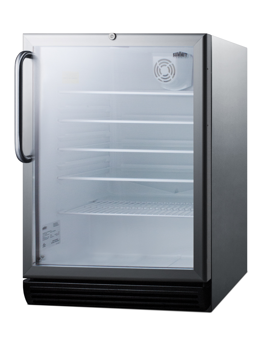 SUMMIT COMMERCIAL's SCR600BGLBI Series features 24" wide beverage refrigerators designed and manufactured in Europe for built-in undercounter installation in commercial settings.Sized with a convenient 24" footprint and generous 5.5 cu.ft. interior, the SCR600BGLCSS features a front-breathing design for built-in installation under counters, with a fully finished stainless steel wrapped cabinet that also allows freestanding use. The door features double pane tempered glass for added protection, with a brushed aluminum finish on the frame. We include our "TB" towel bar style handle in brushed stainless steel. The factory-installed front lock is located towards the top of the door for easier access. Inside, the SCR600BGLCSS includes four adjustable glass shelves for spill-proof storage and a half-sized wire shelf ideal for holding bottles in place. Automatic defrost ensures minimum user maintenance and a dial thermostat makes it simple to manage the temperature. This unit features an interior light operated with an ON/OFF rocker switch and a white interior finish to ensure optimum product visibility. Our unique "hidden" evaporator is located in the rear wall to help protect the unit's system and maximize shelf space. An internal fan helps to ensure the interior is more evenly cooled from top to bottom.The SCR600BGLCSS is ETL-S listed to NSF-7 commercial standards. For this unit sized at 32" for use under lower ADA compliant counters, see the SCR600GBLBIADA series.