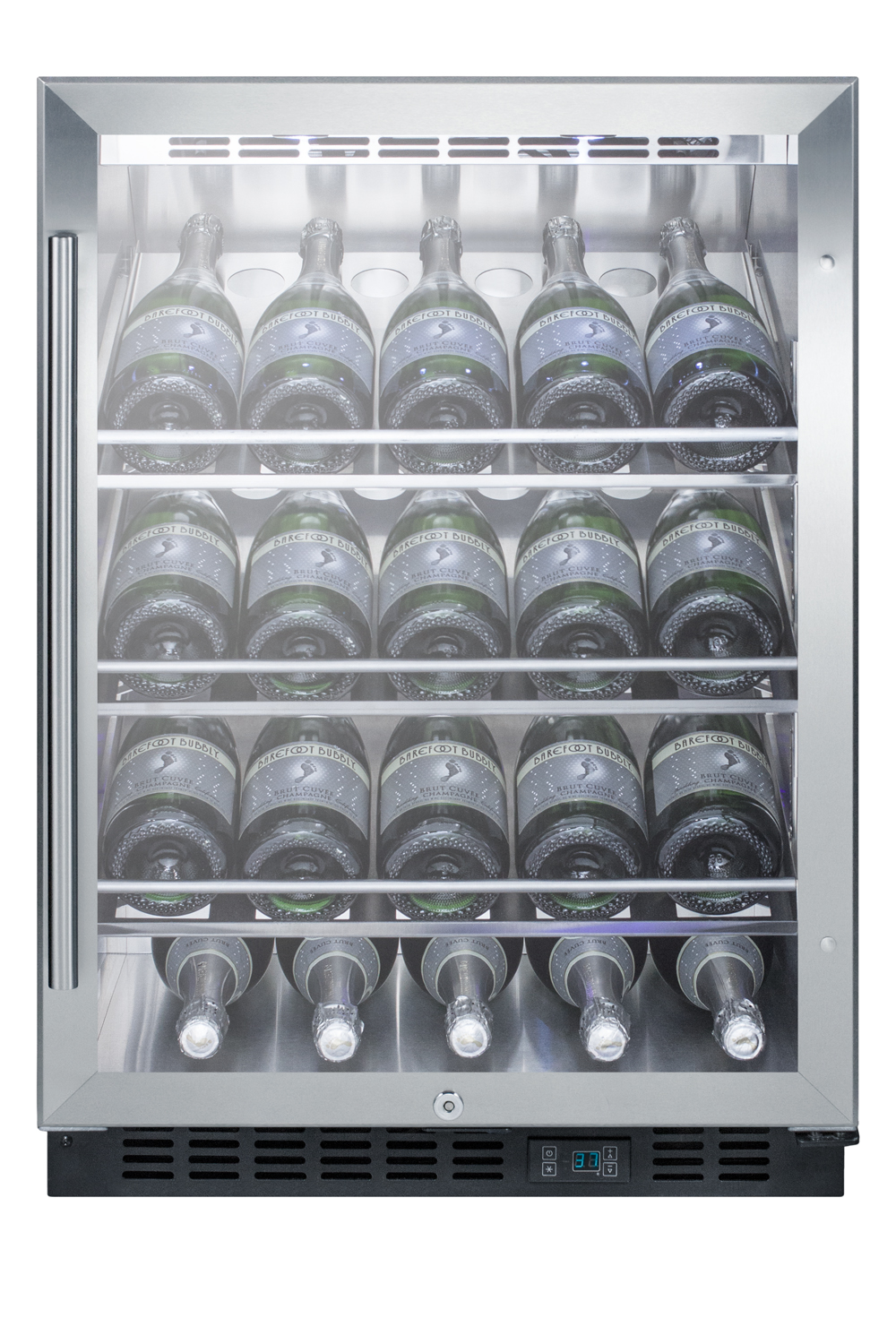 Summit Commercial offers a unique selection of wine cellars designed for optimum storage and bottle presentation.The SCR610BLCHCSS is an undercounter wine cellar built to meet NSF-7 commercial standards. The slim 24 inch footprint takes up minimum floor space, with large 5 cu.ft. interior. This unit features a front-breathing design for built-in installation, with a stainless steel wrapped cabinet that also allows freestanding use. The reversible stainless steel trimmed glass door includes a pro style handle and factory-installed lock for added security. Inside, the SCR610BLCHCSS includes stainless steel shelving specially designed to hold champagne and sparkling wine bottles at a slight angle, providing a full display of the label. The interior walls and floor are constructed from stainless steel for lasting durability in busy commercial settings. This unit is illuminated through the rear walls with efficient LED lighting in a striking blue hue. Digital controls make it easy to manage the interior. With its unique design and commercial grade construction, the SCR610BLCHCSS is the perfect undercounter option for storing and displaying larger bottles. Additional choices are available for outdoor use, and in larger sizes for higher bottle capacity. Browse our website for more options.