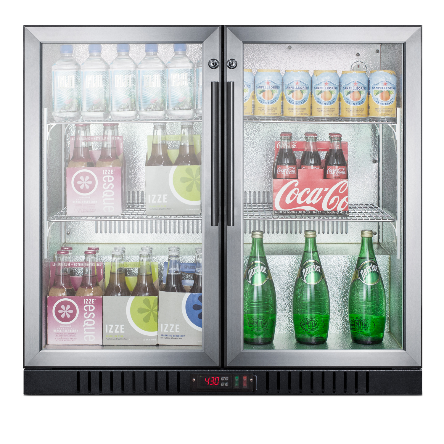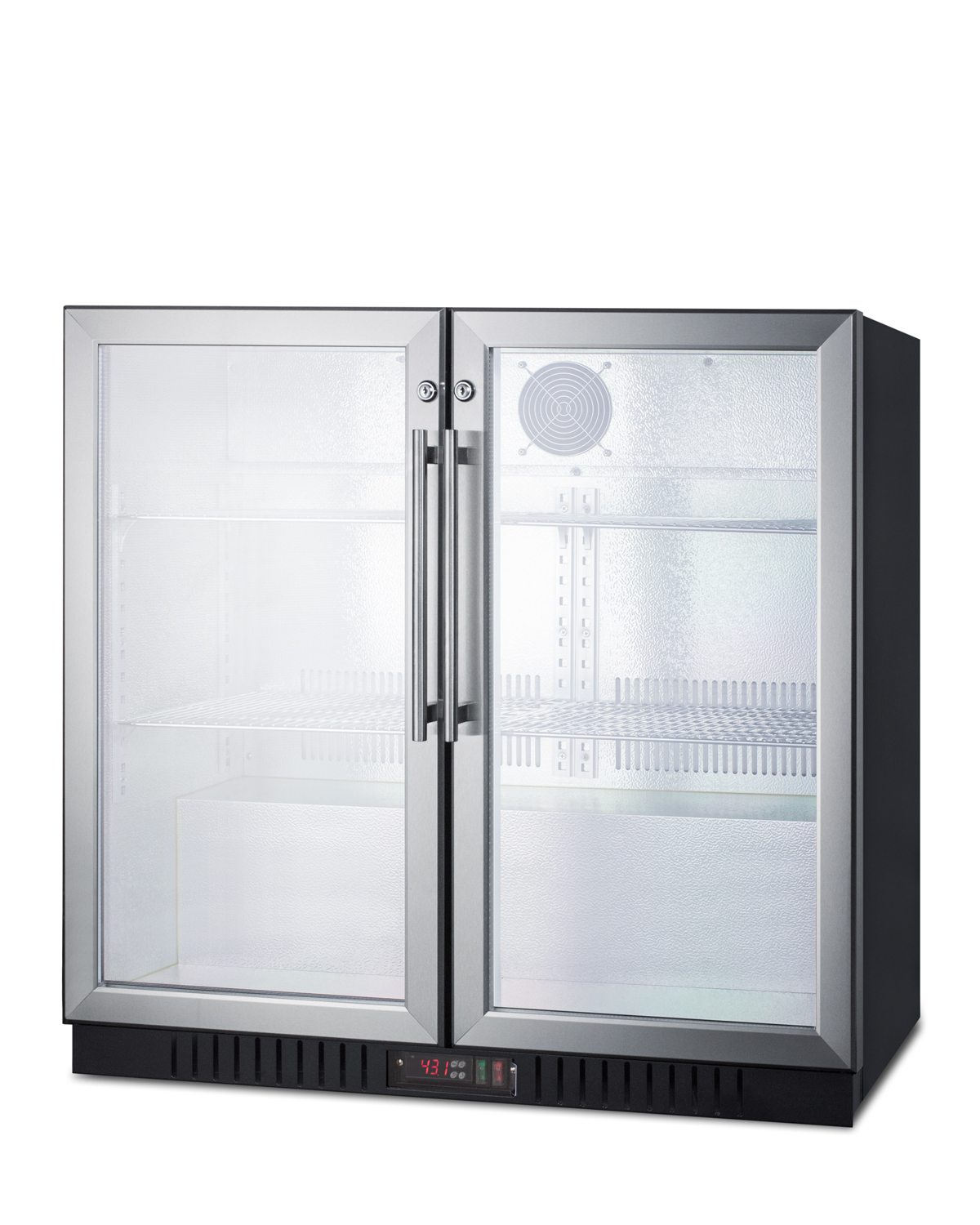 SUMMIT's SCR7012DB is a commercial beverage merchandiser designed to maximize impulse sales.This commercially approved all-refrigerator utilizes automatic defrost for low maintenance, with a digital thermostat for easy temperature control. Adjustable chrome shelves on a cantilevered system let you customize the hammered aluminum interior to accommodate different sized items. Full interior lighting ensures an attractive product display.Two solid glass doors are trimmed with stainless steel and equipped with front-mounted locks for added security. Both are self-closing to help ensure stored items aren't accidentally left exposed to room temperature. Stainless steel handles complete the professional look. This unit comes with a textured black cabinet finish.This model is ETL-S listed to NSF-7 commercial standards. Set this unit above or below the counter (with proper ventilation) as a self-service refrigerator for impulse buys.