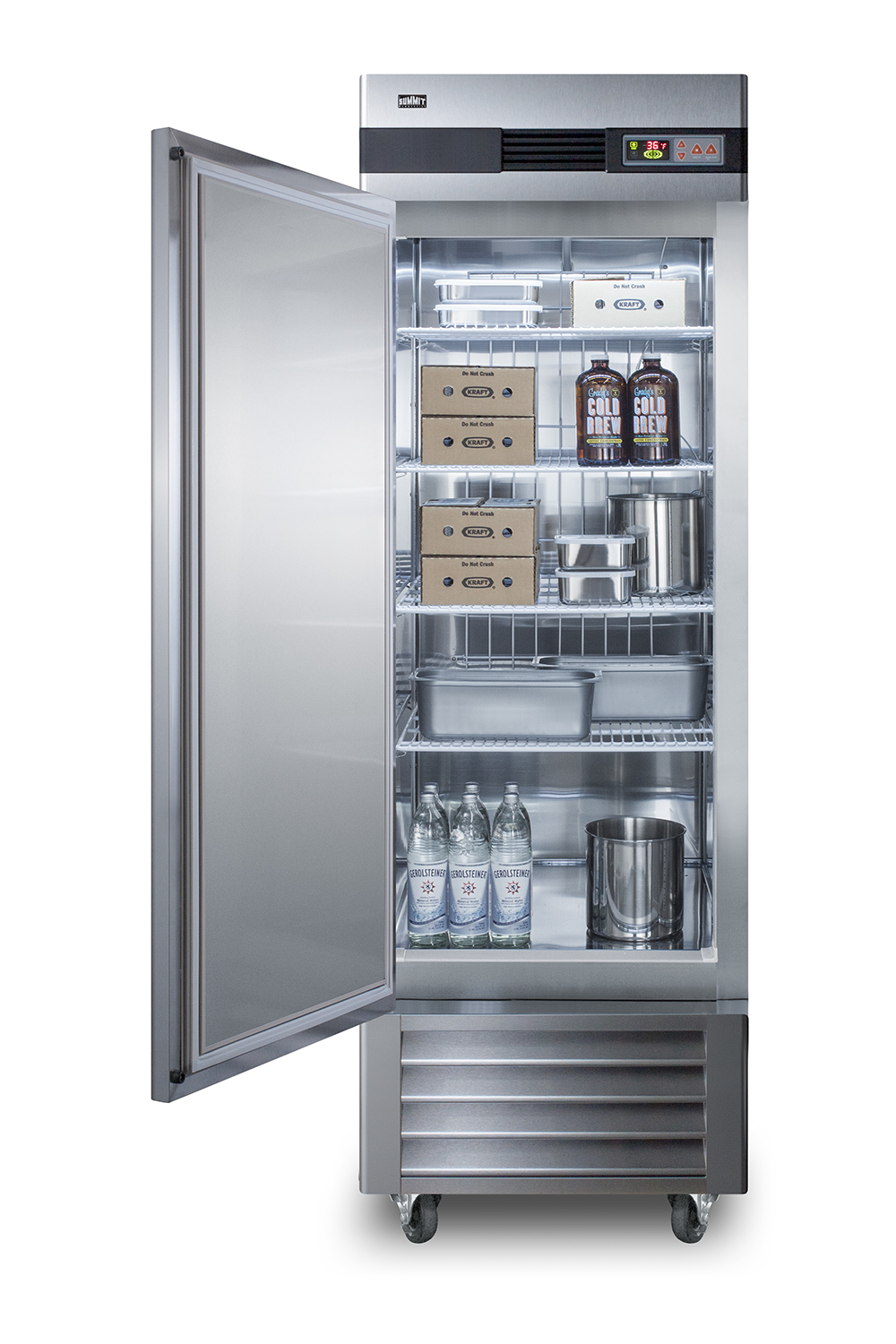 Summit Commercial's line of reach-in refrigeration features durable construction built to NSF-7 commercial standards.Made in South Korea, the SCRR232LH is a commercial all-refrigerator with a complete stainless steel cabinet. The stainless steel door features a self-closing design to help protect stored contents in busy commercial settings where customers may not take the time to make sure the door is closed. It will remain open when pushed to 90º, making it easier to load and unload the unit. The sealed back design helps to simplify cleanup. This unit features a factory-installed lock located towards the top of the door for convenient security. We include a set of locking casters for optional installation. The door has a left hand swing. For the same unit with the door opening from the other side, see the SCRR232.The SCRR232LH features a large 23 cu.ft. interior constructed from stainless steel for easy cleanup and lasting durability. The cantilevered shelving system allows you to adjust the four vinyl-coated shelves to virtually any position, making it easy to accommodate any sized item. This unit is designed to fit common commercial baking trays. The LED lighting offers an energy efficient display when the door is opened. This unit utilizes adjustable cycle defrost operation to avoid temperature spikes, with a top-mounted forced air cooling system to ensure rapid temperature recovery.To ensure optimum storage conditions, the SCRR232LH is equipped with a microprocessor temperature controller that makes it easy for staff to adjust the temperature. The large digital LED readout displays the current and high/low temperatures in Celsius or Fahrenheit. An audible and visual temperature alarm sounds if the unit rises or falls above a user-set range. Additional alarms include a power failure alert, door open alarm, and a condenser cleaning reminder. Designed with hydrocarbon refrigerant, the SCRR232LH provides an energy efficient solution to large capacity storage. It is
