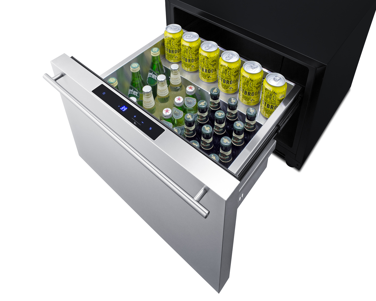 Summit manufactures an extensive selection of built-in refrigeration specially constructed for safe and reliable cooling in outdoor kitchens. The SDR241OS is a single drawer all-refrigerator that meets NSF-7 and UL-471 commercial standards and is also approved for residential settings. It's sized at just under 24" wide for an easy fit in standard cutouts, with a front-breathing design that allows built-in installation. The weatherproof construction allows safe use in outdoor settings, with a sealed back and fully finished black cabinet to ensure all components are protected from the elements. The drawer is constructed from 304 grade stainless steel, with a pro style handle and fully finished front. For more custom style, the drawer is panel-ready, allowing you to match or complement existing cabinetry in a few simple steps (suggested panel dimensions: 15.6" H x 23.4" W at 3/4" maximum thickness).Frost-free operation with fan-forced cooling ensures even temperature distribution with minimal user maintenance. A digital thermostat, located atop the refrigerator drawer, makes it easy to manage the temperature, with an LED display that can be read in Celsius or Fahrenheit. We include a removable clear cover that helps protect all components from the elements. To adjust the settings, slide the off to access the screen. Inside, the SDR241OS offers a full 2 cu.ft. capacity to accommodate your storage needs. Two removable dividers let you separate the drawer into one, two, or three zones to accommodate a variety of sizes. We also include a half-sized glass shelf. LED lighting affords a convenient view of store contents, while a child lock will disable the digital controls after two minutes of inactivity to prevent accidental adjustments. Additional features include audible alarms for high-temperature fluctuations and open drawer alerts, while a temporary memory function helps to recover all settings in the event of power loss. The Sabbath Mode setting disables certain electr