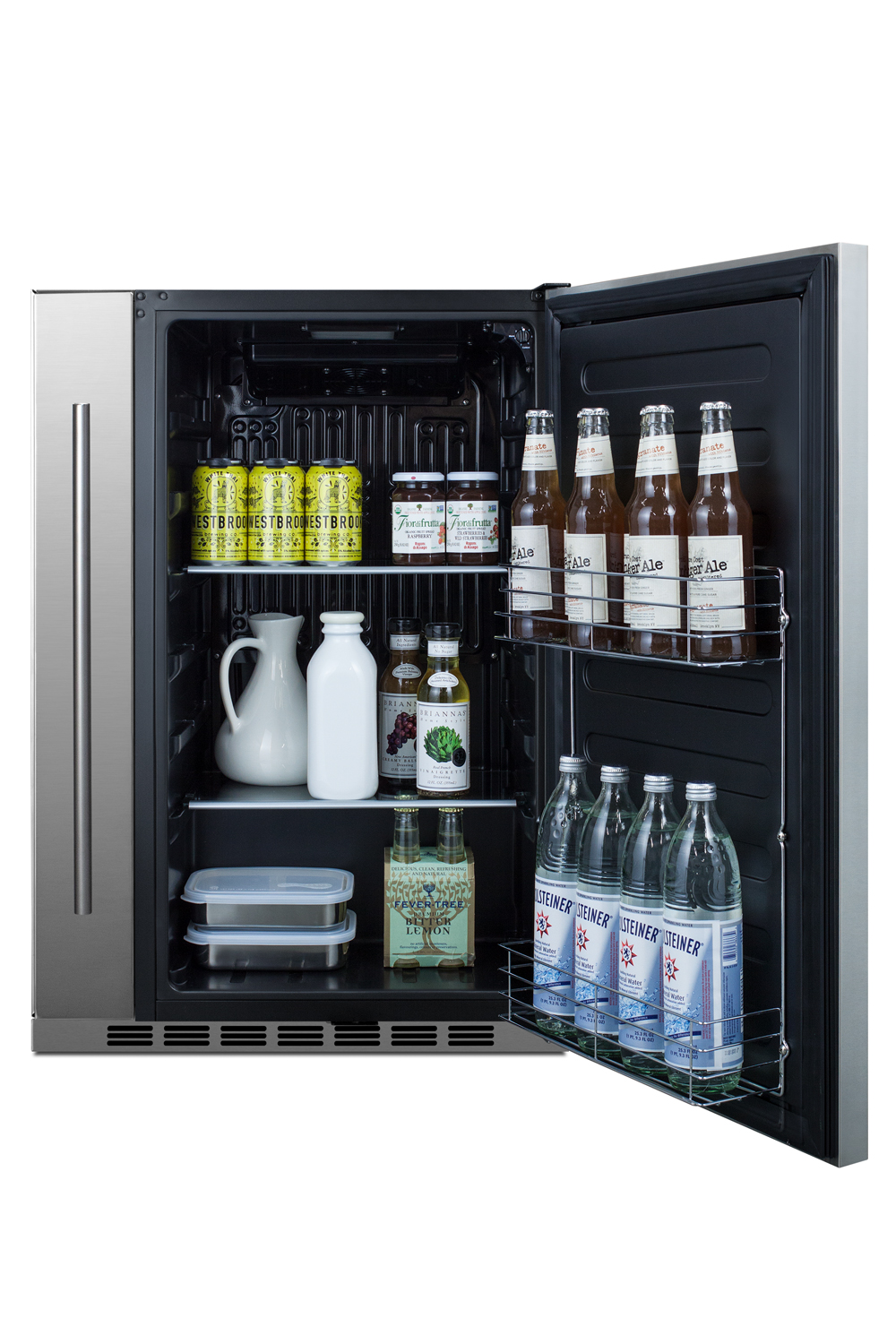 Summit's shallow depth series of built-in undercounter refrigeration includes residential outdoor options with pull-out side compartments for added storage convenience in a modern style.The SPR196OS24 is sized at just 24 inches wide and 17.25 inches deep, with a front-breathing design for built-in installation under counters and a fully finished stainless steel wrapped cabinet to also allow freestanding use. The sealed back ensures safe installation outdoors and protection from the elements. The stainless steel refrigerator door and storage drawer front bring elegance to any setting, with pro-style handles to complete the look. A factory-installed lock offers added security in the refrigeration compartment, while the space-saving right-angle plug and integrated hinge provide added flexibility in unit placement. For added protection against the elements, we include a vinyl outdoor cover to ensure proper protection while not in use. Two leveling legs keep the unit level on uneven surfaces.For added storage convenience, this unit includes a non-refrigerated pull-out storage compartment in complete stainless steel, with a matching handle to the refrigerator section. The interior features two height adjustable stainless steel full-width shelves providing storage space for non-heat sensitive items such as glassware and sealed, shelf-stable foods including canned goods, dried fruits, crackers, and certain boxed foods like mac and cheese. We include three adjustable two-prong peg hooks that let you hang lighter accessories such as tongs and other cooking utensils. The upper part of the cabinet is slotted, allowing you to suspend slimmer glasses from the ceiling. Inside, the SPR196OS24 utilizes an internal fan to ensure the unit is evenly cooled from top to bottom. An automatic defrost system ensures minimal user maintenance, while LED lighting allows full visibility of stored items in the jet black interior. Three adjustable slide-out glass shelves with six placement positi