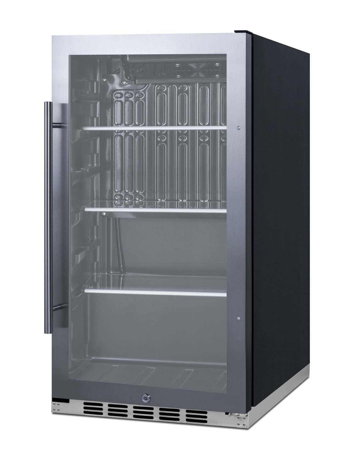 Summit's line of built-in undercounter outdoor appliances includes slim-fitting display beverage centers designed for optimum storage and product presentation.The SPR488BOSH34 features a versatile design that meets NSF-7 and UL-471 commercial standards, but is also approved for residential use. Sized with a slim 19 inch width and 17 3/4 inch shallow depth, it features a black cabinet with a sealed back for safe installation in the outdoors. The height can be adjusted between 33 7/8 and 34 1/2 inches to best suit your space. The user-reversible double pane tempered glass door features seamless stainless steel trim and a pro style handle. Customers supply their own handle to best match their setting. This unit is equipped with a right angle plug and integrated hinge for added space savings.Inside, the SPR488BOSH34 utilizes an internal fan to ensure the interior is evenly cooled from top to bottom, while the automatic defrost system allows for minimal user maintenance. LED lighting allows full visibility of stored items in the jet black interior. Three adjustable glass shelves with six positions provide optimal storage capacity inside the 3.1 cu. ft. interior. The dial thermostat, with seven temperature settings, is located in the upper-right corner for easy temperature management. The SPR488BOSH34 can be installed indoors or outdoors and is designed for built-in or freestanding use. Additional panel-ready choices are available in 15 inch, 18 inch, and 24 inch wide fits. Browse our full selection to find the perfect fit.