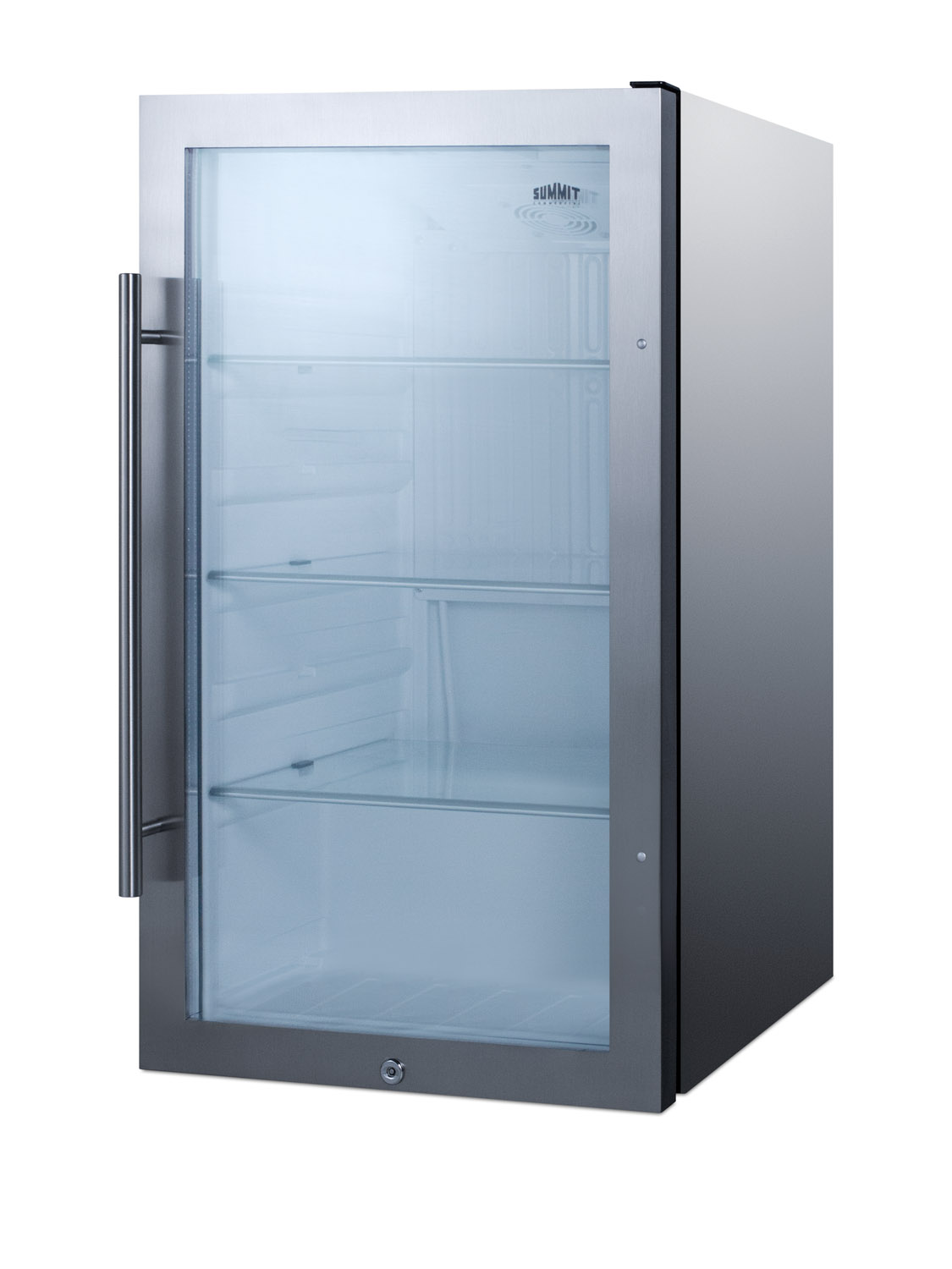 Summit's line of outdoor appliances includes slim-fitting display beverage centers designed for optimum storage and product presentation.The SPR489OSCSS features a versatile design that meets NSF-7 and UL-471 commercial standards, but is also approved for residential use. Sized at just 19 inches wide and 17 inches deep, it features a stainless steel cabinet with a sealed back for safe installation in the outdoors. The user-reversible double pane tempered glass door includes a seamless stainless steel trim and a pro-style handle. A factory-installed lock offers added security, while the space-saving right-angle plug and integrated hinge provide added flexibility in unit placement. Two leveling legs keep the unit level on uneven surfaces. Inside, the SPR489OSCSS utilizes an internal fan to ensure the interior is evenly cooled from top to bottom. An automatic defrost system allows for minimal user maintenance, while the white interior and LED lighting allow full visibility of stored items. Three adjustable glass shelves with six positions provide optimal storage capacity inside the 3.1 cu. ft. interior. The dial thermostat, with seven temperature settings, is located in the upper-right corner for easy temperature management. The SPR489OSCSS can be installed indoors or outdoors and is designed for built-in or freestanding use. For this unit in a lower ADA compliant height, see the SPR489OSCSSADA.