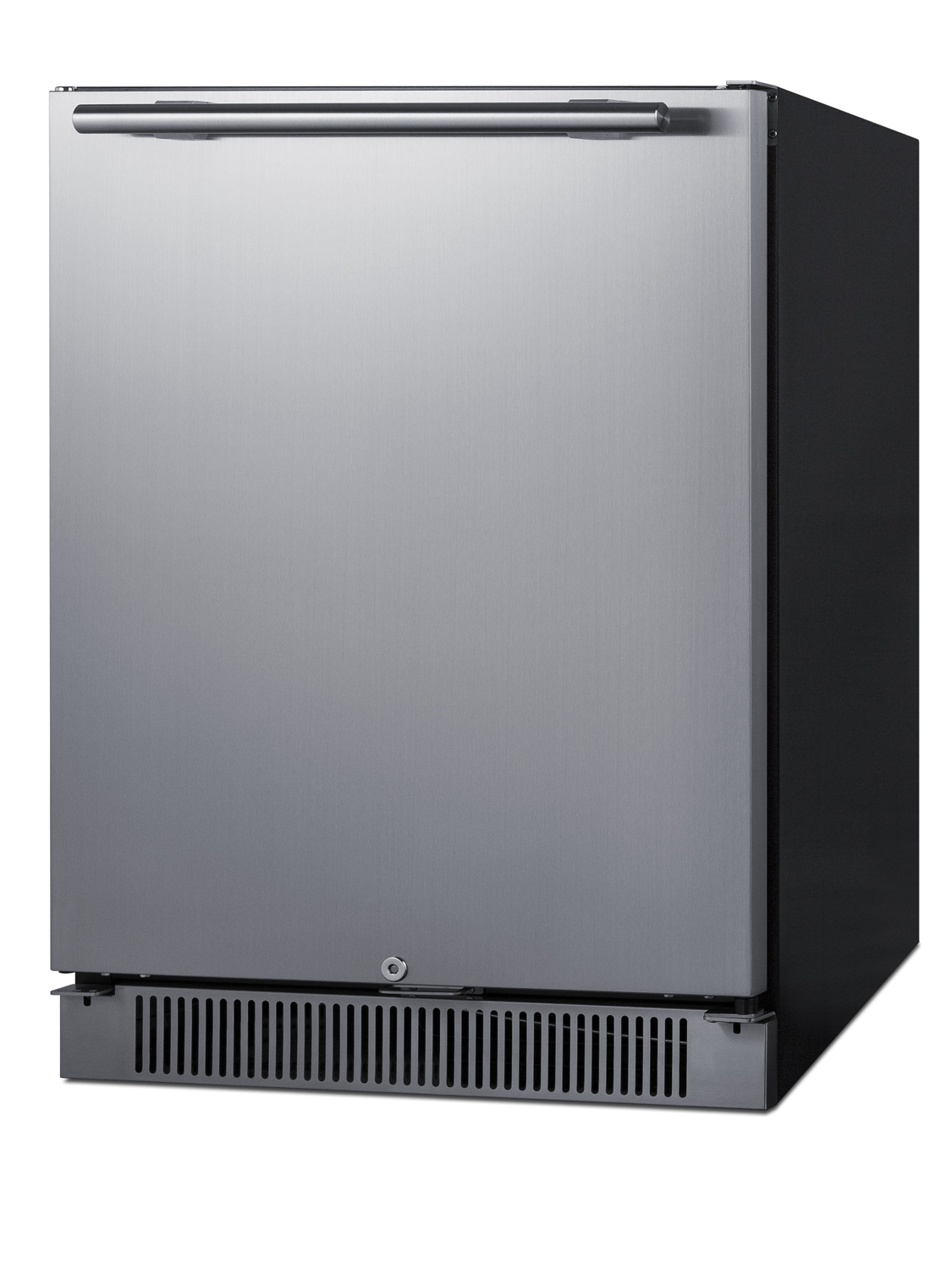 Summit's selection of outdoor refrigeration brings weatherproof luxury to the home, with durable construction and innovative design. Model SPR623OS is an outdoor all-refrigerator sized with an easy-fitting 24" footprint. The front-breathing design allows built-in installation, while the fully finished cabinet enables freestanding use as well. The weatherproof exterior includes a sealed rear for better protection from the elements. The user-reversible door includes a thick tube style handle mounted horizontally and a factory-installed lock for added security. A designer kickplate completes the look.Inside, the SPR623OS offers maximum convenience with frost-free operation that eliminates the need to manually defrost the unit. Fan-forced cooling ensures the temperature stays consistent. The clean white interior and LED lighting provides a refreshingly bright view, with adjustable glass shelving for versatile storage. The door includes two storage racks ideal for holding condiments. The digital control panel is located inside, with a display switchable from Fahrenheit to Celsius at the touch of a button. This unit also includes an optional Sabbath Mode setting that disables the displays for a period of 96 hours.With advanced features, durable construction and an elegant design, the SPR623OS refrigerator lets you complete any outdoor kitchen in proper style. This unit is approved to both residential and commercial standards.