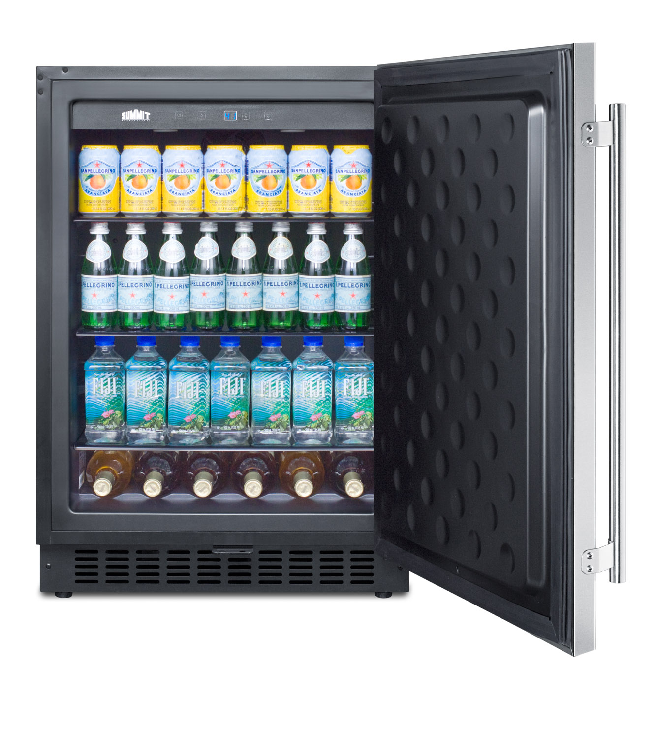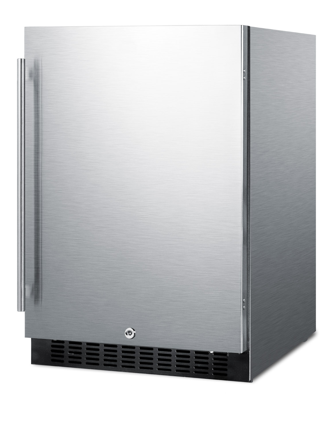 SUMMIT's SPR627OS Series features built-in all-refrigerators equipped with user-friendly features for convenient use in any outdoor kitchen.The SPR627OSCSS is a 24" wide all-refrigerator that can be used built-in or freestanding in any outdoor or indoor location. The cabinet and reversible door feature weatherproof stainless steel construction for lasting durability. A chrome handle completes the look and a factory installed lock offers added security.Inside, this frost-free refrigerator includes an internal fan for an evenly cooled interior and a recessed LED light for an elegant yet energy efficient glow. The digital thermostat (located in the interior) allows you to adjust the temperature at the touch of a button. Adjustable glass shelves make it easy to organize the 4.6 cu.ft. interior. The floor is specially slotted to hold bottles in place. This unit has a flat door liner to accept larger trays. For optional door storage, add our SHELFKIT627.With a stunning design and convenient features, SUMMIT SPR627OSCSS is the ideal finish for any outdoor or indoor kitchen. For a matching freezer, see the SPFF51OSCSS. This unit is ETL-S listed to NSF-7 standards for use in commercial establishments and is ENERGY STAR certified as a commercial refrigerator. It also meets DOE standards for residential applications, using 25% less energy than the maximum allowed for this product class and capacity.