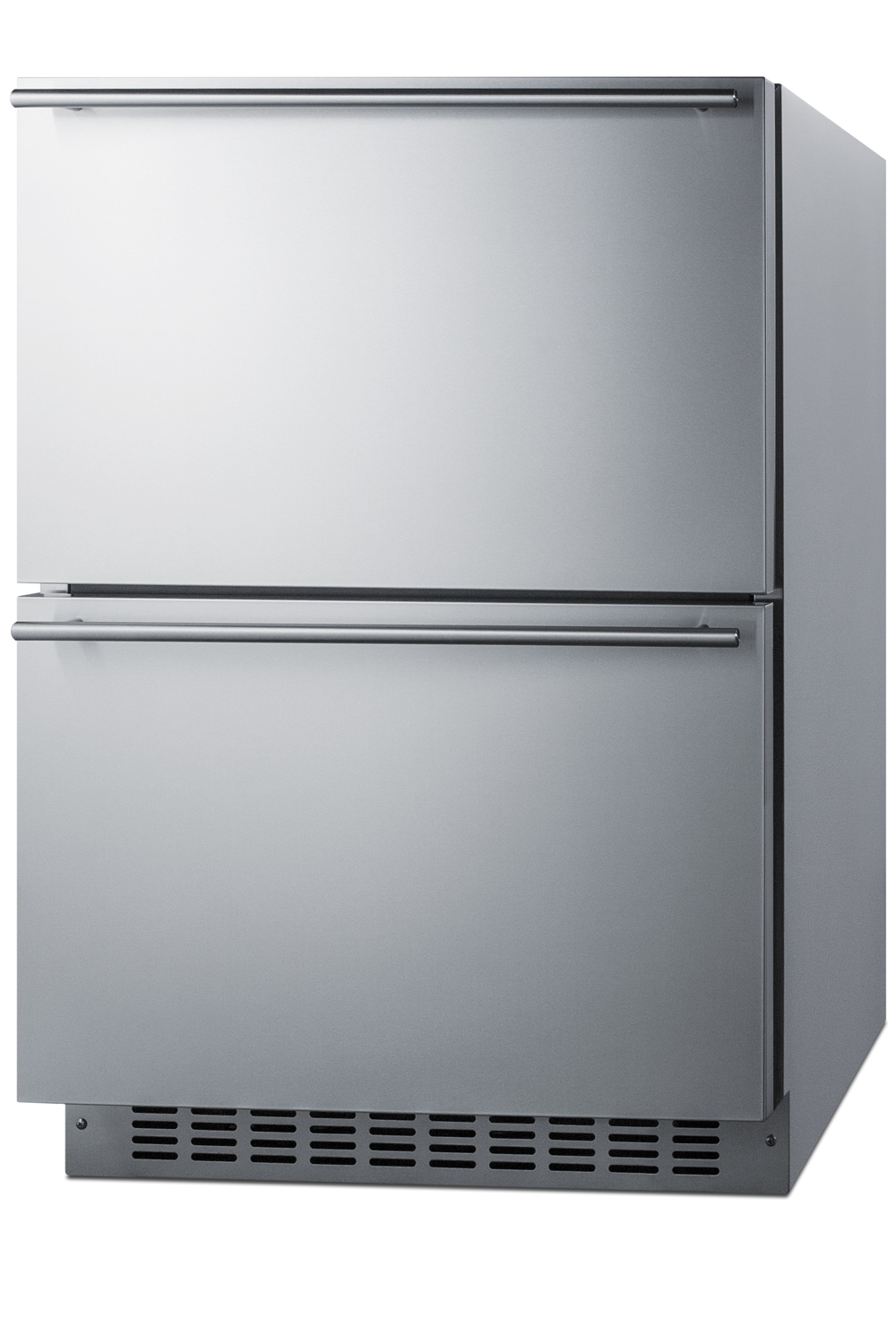 Summit manufactures an extensive selection of drawer refrigeration designed to bring elegant style and modern convenience to any undercounter space. The SPRF34D is a 2-drawer refrigerator-freezer. It has a front-breathing design that allows built-in installation, while the fully finished stainless steel cabinet also enables freestanding use. Complete stainless steel construction inside and out offers long-lasting durability with professional elegance. The drawers can be customized with overlay panels to match or accent existing cabinetry design. The stainless steel kickplate and sleek, stainless steel handles complete the look, while a right-angle plug and sealed back offer added space savings when placing the unit.Inside, the SPRF34D has a generous 3.9 cu.ft. capacity to accommodate your storage needs. Both the top drawer refrigerator and bottom drawer freezer utilize frost-free operation with fan-forced cooling, ensuring an even temperature distribution with minimum user maintenance. A digital thermostat, located atop the refrigerator drawer, makes it easy to manage the temperature, with an LED display that can be read in Celsius or Fahrenheit. Two adjustable, removable dividers make it easy to separate the drawer compartments into two (freezer) or four (refrigerator) zones to easily accommodate a variety of sizes. A full-width sliding, removable chrome basket offers added storage convenience, while white LED lighting in the refrigerator drawer makes it easy to view stored contents. A child lock will disable the digital controls after two minutes of inactivity to prevent accidental adjustments. Additional features include audible alarms for high-temperature fluctuations and open drawer alerts, while a temporary memory function helps to recover all settings in the event of power loss. The Sabbath Mode setting disables certain electrical features during periods of religious observance. With its durable construction and fully-featured design, the SPRF34D makes an att