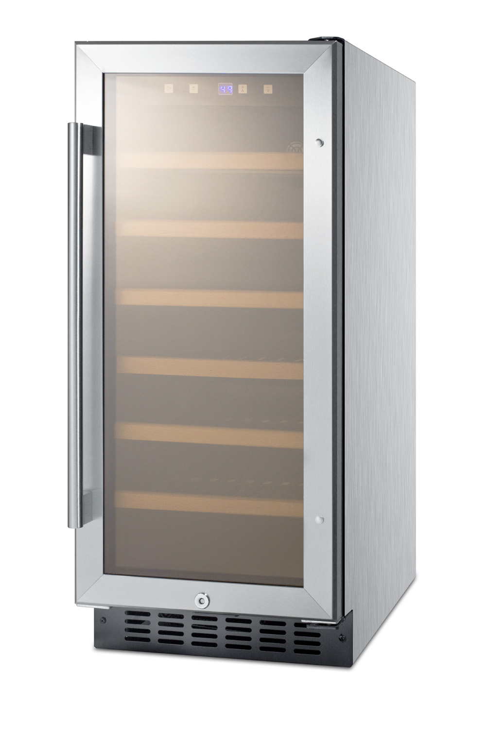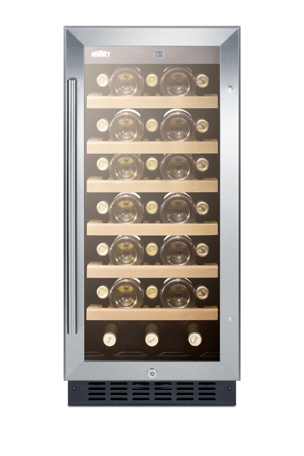 Give your wine collection the proper care with SUMMIT SWC1535BCSS, a slim-fitting wine cellar designed for built-in use under counters.At just 14 ¾" wide, the SWC1535BCSS is thoughtfully sized to store up to 33 Bordeaux style bottles on six slide-out wooden shelves (if using this unit for wider Burgundy style bottles, you can remove every other shelf to accommodate their size). An interior LED light provides an elegant view behind a tempered glass door, elegantly trimmed in stainless steel. The reversible door includes a factory installed lock and professional handle. Inside, the digital thermostat makes temperature management easy and intuitive, with indicator lights to show when the interior is ideal for reds, whites, and sparkling wines.The SWC1535BCSS has a stainless steel wrapped cabinet and flush back design for easy installation under any counter. The unit can be used built-in or freestanding. For a matching glass door beverage refrigerator, see the SCR1536BCSS.