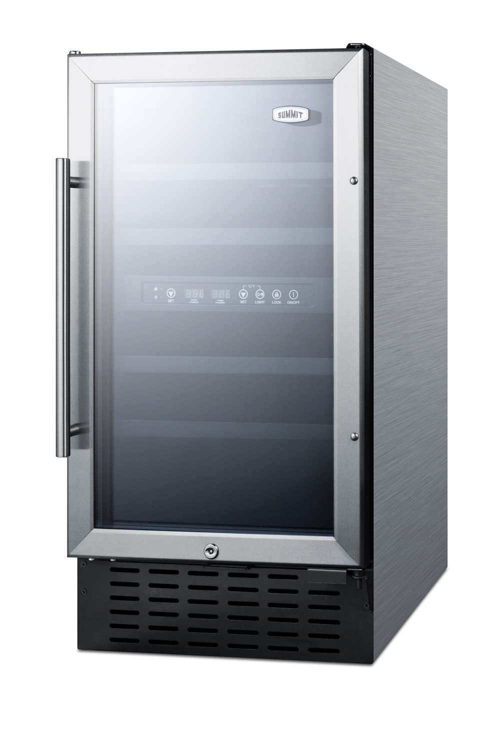 SUMMIT's collection of built-in wine cellars offers fully featured choices in slim fits, allowing smaller kitchens to bring convenient and reliable wine storage for every undercounter space.Sized just under 18" wide and 32" high, the SWC182ZCSSADA is front-breathing for built-in installation under lower ADA compliant counters. The cabinet is wrapped in 304 grade stainless steel for a professional look built to last. The reversible glass door features an elegant stainless steel trim and professional handle. A factory installed lock offers added security, with two keys included.Two separate zones allow you to store your reds and whites at their own temperature, ensuring each bottle is kept under the proper conditions. This unit can hold up to 28 standard Bordeaux style bottles or 22 wider Burgundy style bottles. The wooden shelves feature a black finish for a modern look, with recessed LED lighting to provide an attractive and efficient presentation. The digital controls are located in the center for easy temperature management.With its slim fit and convenient design, the SWC182ZCSSADA makes an attractive addition to any room.