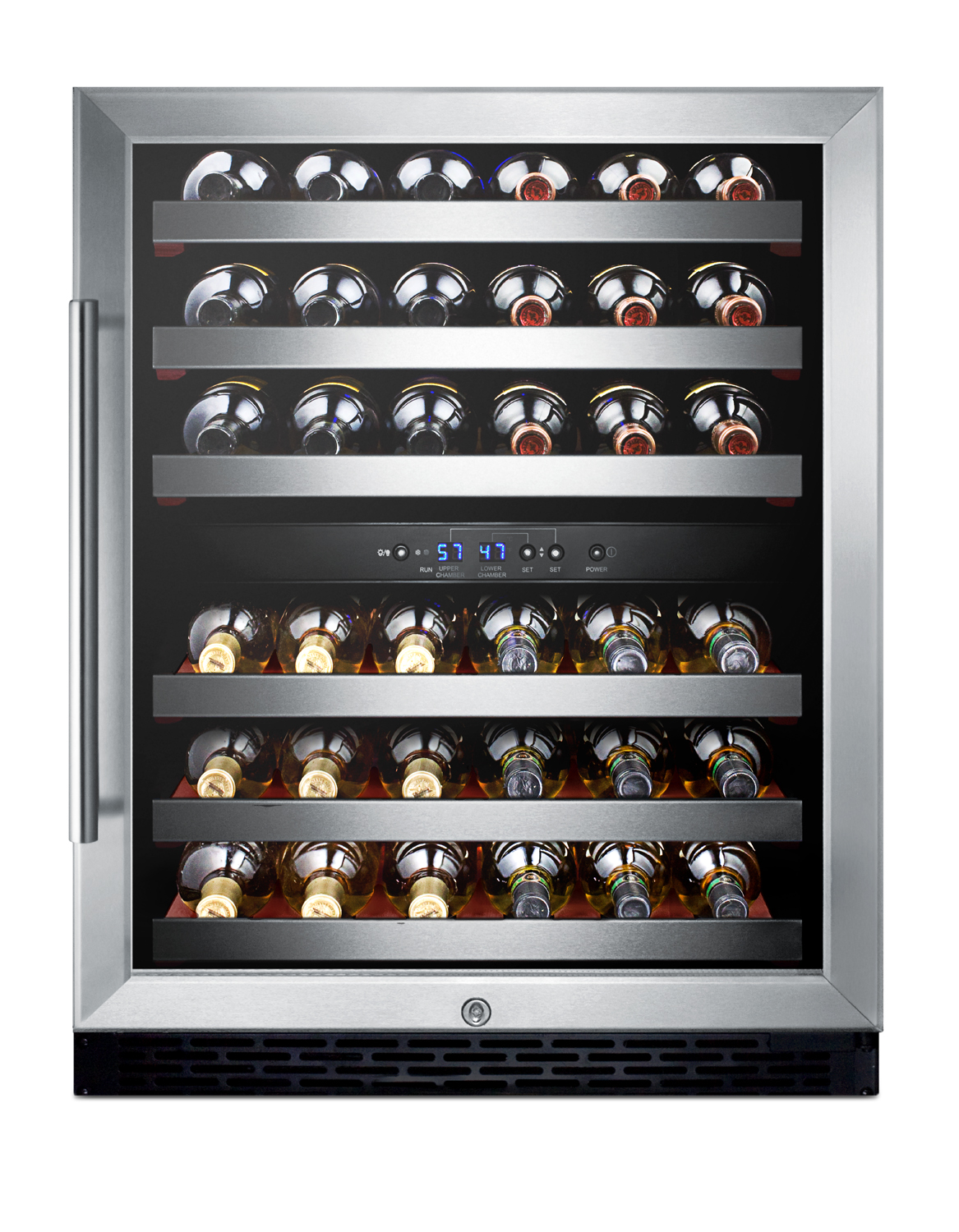 Store your finest collection in the SWC530BLBISTCSSADA, an ADA compliant built-in wine cellar with advanced features and stunning design.Two digital thermostats allow you to chill your white wine while separately preserving red at a warmer temperature. Slide-out wooden shelves with stainless steel trim let you store up to 46 standard 750ml sized Bordeaux bottles. Alternatively, you can store up to 40 bottles of the wider Pinot Noir or Chardonnay bottles, while still fitting an additional six Bordeaux bottles. Full automatic defrost, interior lighting, and SUMMIT's own "hidden" evaporator help to keep use and maintenance simple.At 32" high, the SWC530BLBISTCSSADA can be used built-in or freestanding under lower ADA compliant counters. The cabinet is fully wrapped in stainless steel, with a reversible glass door to best display your collection. A professional stainless steel door handle completes the look.