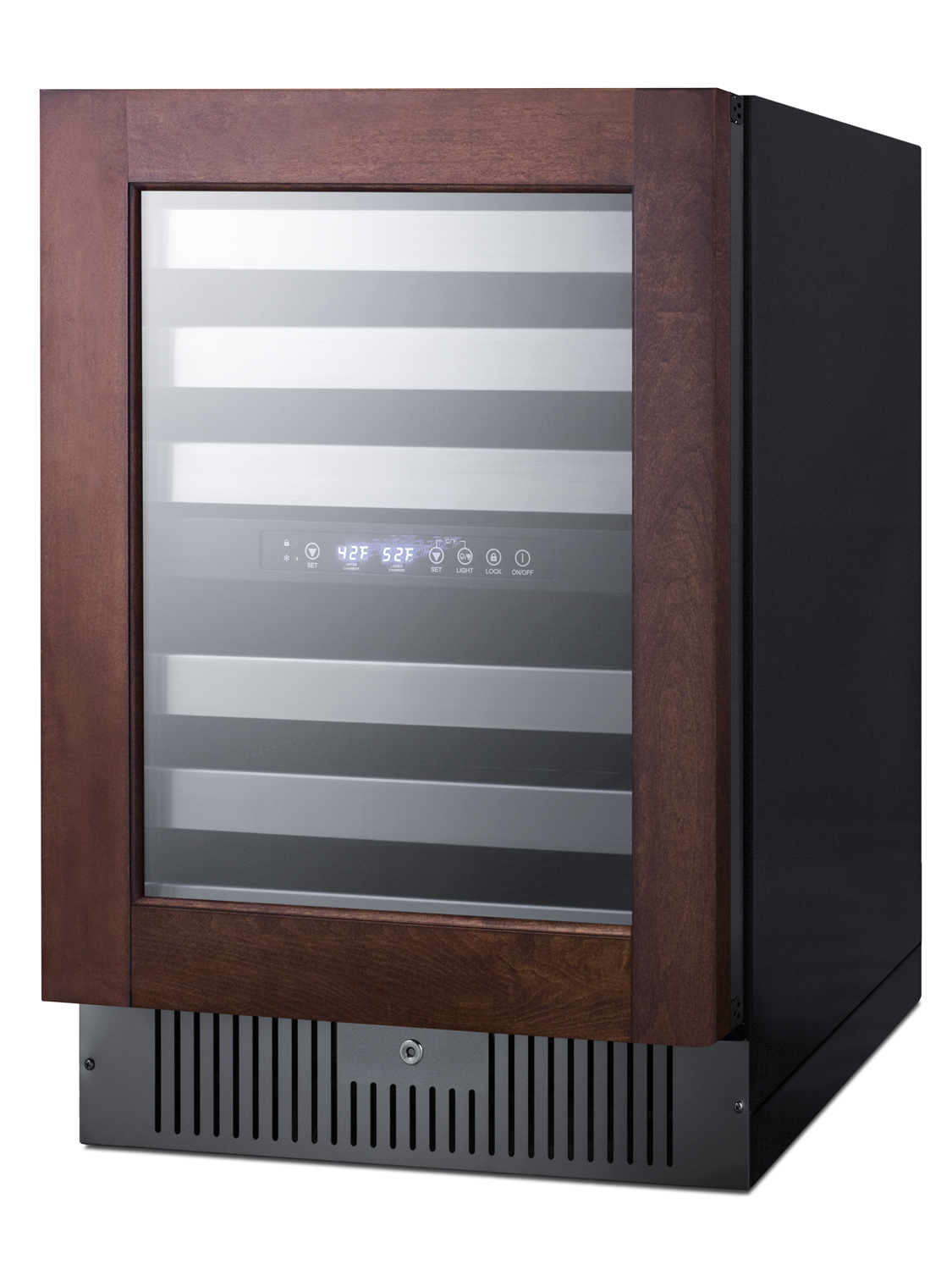 Summit's extensive selection of built-in undercounter commercially approved wine cellars includes elegant choices that let you achieve a custom look ideal for any space.The SWC532BLBISTPNRLHD is a dual zone wine cellar sized for 24" spaces. The front-breathing design allows built-in installation, while the fully finished black cabinet also enables freestanding use. The panel-ready door features our fully articulating European style hinging, with a 2-piece bracket kit included to allow easy installation of your own custom door trim to match or blend into adjacent cabinetry. A factory-installed lock offers added security and a stainless steel kickplate completes the look. Inside, the SWC532BLBISTPNRLHD is designed to store up to 46 standard Bordeaux style bottles, or a combination of 30 Bordeaux and 16 wider Burgundy bottles. The digital control panel allows you to manage the upper temperature chamber between 41 and 50ºF for white wine, while the lower zone is designed to store red wine between 50 and 64ºF. Six full-extension black wire shelves with stainless steel front trim move out smoothly on ball-bearing glides for easy loading. Both compartments include recessed LED lighting in a gentle blue hue for an attractive and efficient presentation.This unit is ETL-S listed to NSF-7 commercial standards. With its advanced user features and versatile design, the SWC532BLBISTPNRLHD makes a great addition to any ADA compliant setting looking to store wine in modern style. Additional panel-ready wine cellars are available in more sizes (including shallow depth). Explore the full Summit line to discover the perfect choice for your space.