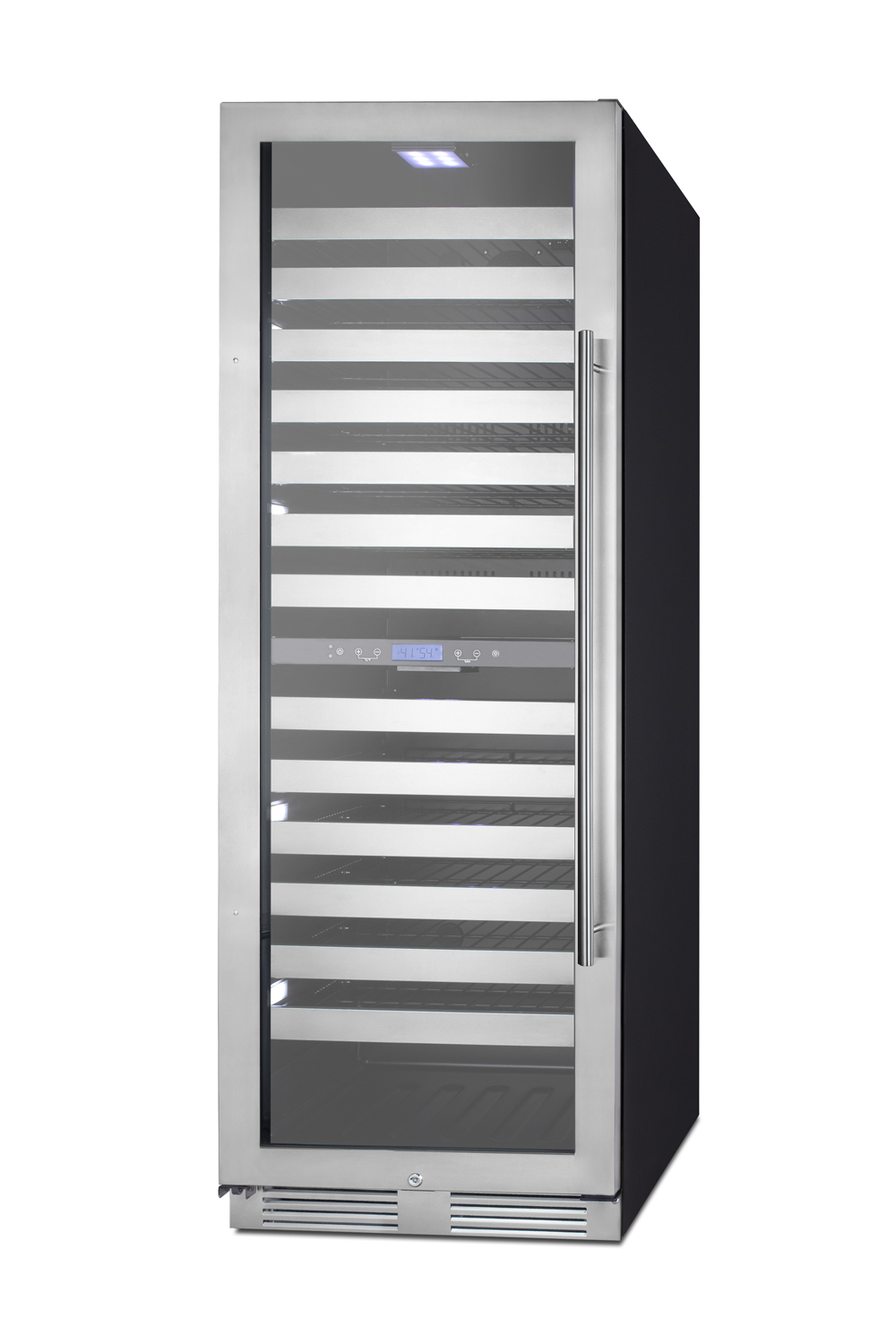Summit offers a unique selection of built-in capable full-sized wine cellars with a versatile luxury design ideal for residential or commercial useThe SWCP2163LHD is a 24" wide dual zone wine cellar that is ETL-S listed to NSF-7 commercial standards. The upper zone is reserved for white and sparkling wine, while the lower zone features a warmer temperature range to best preserve reds. It features a front-breathing design for built-in installation, with a fully finished black cabinet that also allows freestanding use. Sized just under 27" deep, this unit has a sealed back and right angle plug for added depth savings. The luxury exterior features a double pane tempered glass door with a seamless stainless steel trim. A stainless steel kickplate provides added elegance, while the pro-style handle completes the look. This unit includes a factory-installed keyed lock for added security and powerful magnetic gaskets to ensure a proper seal in high-traffic commercial settings. This unit comes with a left-hand door swing. (Note: the door is not user-reversible. For a right-hand door swing, see the SWCP2163.)Inside, the SWCP2163LHD includes 13 full-extension black wire shelves positioned on ball bearing glides for smooth loading. Stainless steel fronts offer a modern touch. Optimal storage capacity accommodates up to 163 standard 750ml Bordeaux bottles (note: your capacity may vary depending on the bottle style). For wider Burgundy style bottles (typically used for Pinot Noir and Chardonnay), the SWCP2163 can hold up to 110 bottles. Nine white LED lights positioned on the sides and top of the unit attractively illuminate your collection for a stylish display. An internal fan ensures both zones are properly chilled, while a charcoal filtration system keeps the interior odor-free. Additional features include an open door alarm and high/low temperature alarm that sound if the unit temperature goes out of range.With its convenient size, advanced features, and luxury design, the