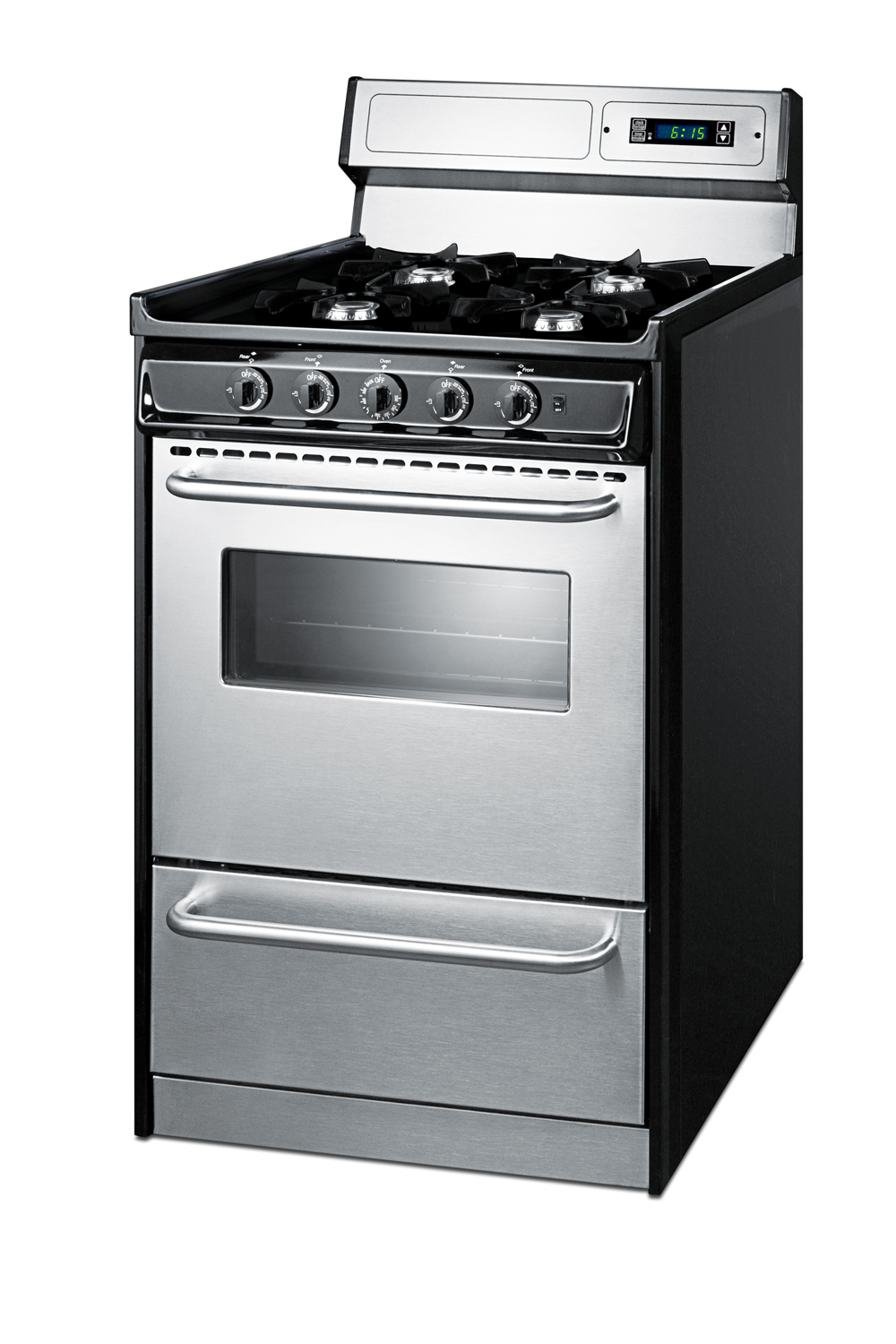 Summit Appliance offers a wide selection of American-made household ranges built for long-lasting durability in space-challenged kitchens. The TNM1307BKW is 20" wide apartment-sized gas range with a generous 2.46 cu.ft porcelain oven interior that can fit large trays. Two adjustable oven racks are included. An oven window and on/off interior light allow you to easily keep watch over your cooking. The broiler is located below the oven in a drop-down compartment. Four open 9000 BTU gas burners accommodate most of your stovetop heating needs, with upfront push-to-turn knobs that let you adjust your cooking without reaching over hot burners. This unit utilizes an electronic ignition system for added safety.Stainless steel doors feature professional style towel bar handles, bringing classic elegance to smaller kitchen spaces. The deluxe 8" high backguard includes a digital clock and timer for added convenience when cooking. This unit has a recessed oven door and is conveniently sized at just 24" deep for a better fit in galley in L-shaped kitchens, where every inch counts.With its classic style and quality construction, Summit's made in the USA cooking line offers reliable cooking for smaller homes. Additional choices are available in 24", 30", and 36" wide fits. This unit ships ready for natural gas connections. To use with propane, add the Kit LP.