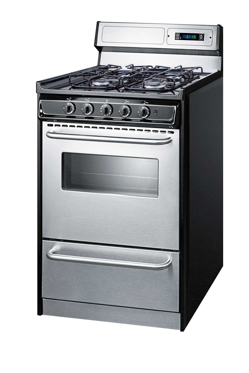 Summit Appliance offers a wide selection of American-made household ranges built for long-lasting durability in space-challenged kitchens. The TTM1307BKSW is 20" wide apartment-sized gas range with a generous 2.46 cu.ft porcelain oven interior that can fit large trays. Two adjustable oven racks are included. An oven window and on/off interior light allow you to easily keep watch over your cooking. The broiler is located below the oven in a drop-down compartment. Four sealed 9100 BTU gas burners accommodate most of your stovetop heating needs, with upfront push-to-turn knobs that let you adjust your cooking without reaching over hot burners. This unit utilizes an electronic ignition system for added safety.Stainless steel doors feature professional style towel bar handles, bringing classic elegance to smaller kitchen spaces. The deluxe 8" high backguard includes a digital clock and timer for added convenience when cooking. This unit has a recessed oven door and is conveniently sized at just 24" deep for a better fit in galley in L-shaped kitchens, where every inch counts.With its classic style and quality construction, Summit's made in the USA cooking line offers reliable cooking for smaller homes. Additional choices are available in 24", 30", and 36" wide fits. This unit ships ready for natural gas connections. To use with propane, add the Kit LP S2.