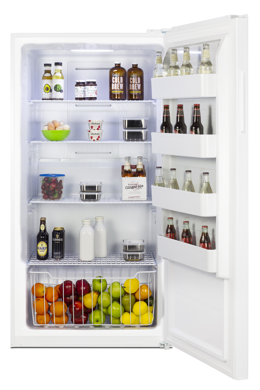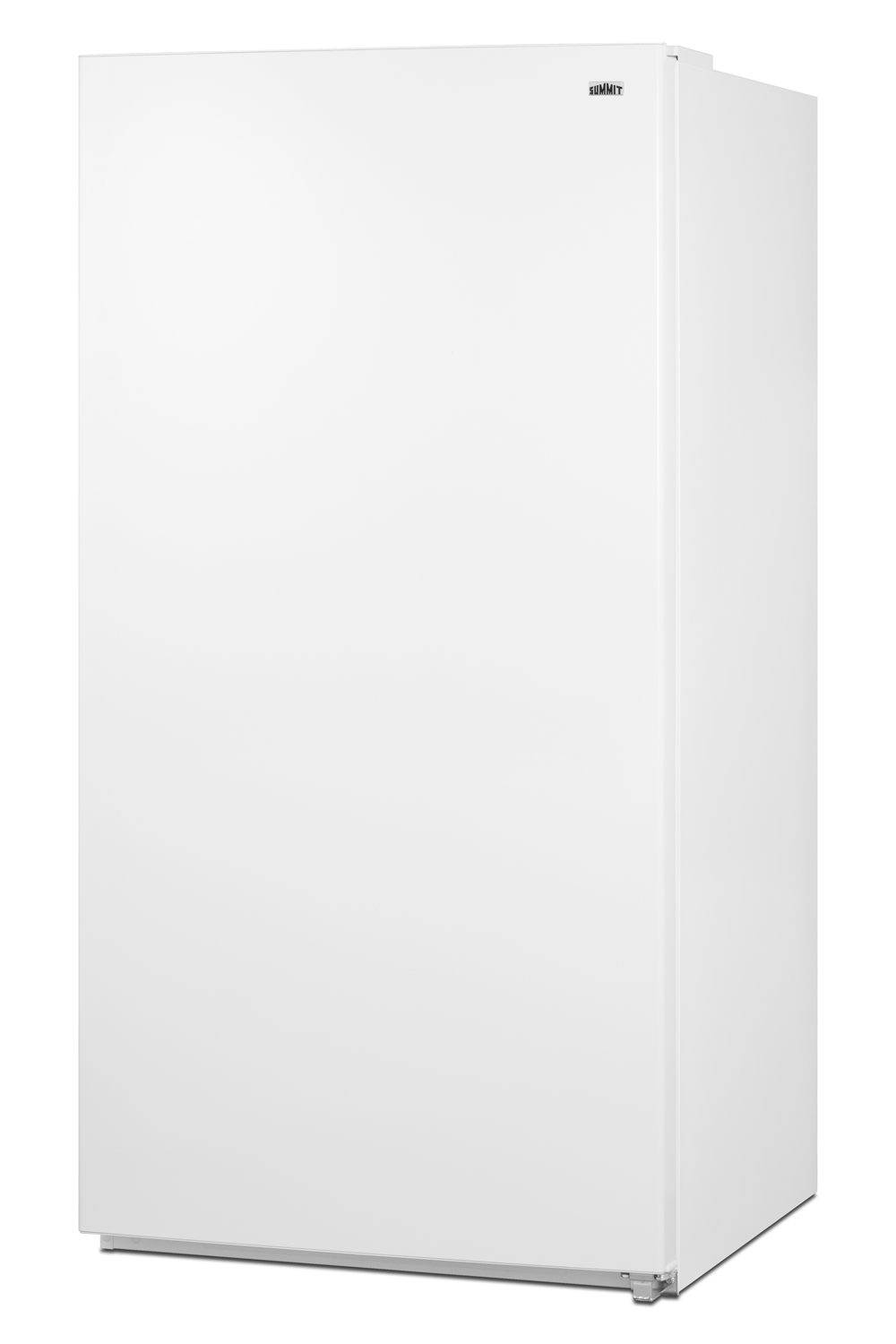 Summit's selection of full-sized refrigeration offers versatile solutions for maximizing cold storage, with upright frost-free convertible freezers that can also be set at refrigerator temperatures. Model UF18W is a front-opening residential freezer that offers a full 17 cu.ft. of storage capacity. A touch control thermostat inside allows users to easily manage the temperature, as well as switch between refrigerator/freezer functionality as needed. Four adjustable wire shelves let you accommodate a variety of sizes, while a lower wire pull-out basket is included for additional storage as needed. Four removable in-door storage racks are ideal for holding condiments, frozen meals, ice cream, and other items. Frost-free operation ensures minimum maintenance and LED lighting makes it easy to navigate the large interior.This unit comes in a textured white exterior finish. The garage-ready design allows you to use this as a freezer in temperatures as low as 0ºF and high as 110ºF (note: the refrigerator function will only stay in range if the ambient temperature is above 38ºF). The sealed back ensures easy cleanup, with a right angle plug for a flush fit into your outlet for added space savings. The door features top and side grips to make it easier to move as needed, with powerful magnetic door gaskets that create a tight and energy efficient seal. This unit ships with a non-reversible right hand door swing.With its versatile functionality and convenient design, this is the ideal freezer (or refrigerator) for any home in need of extra fresh or frozen cold storage.
