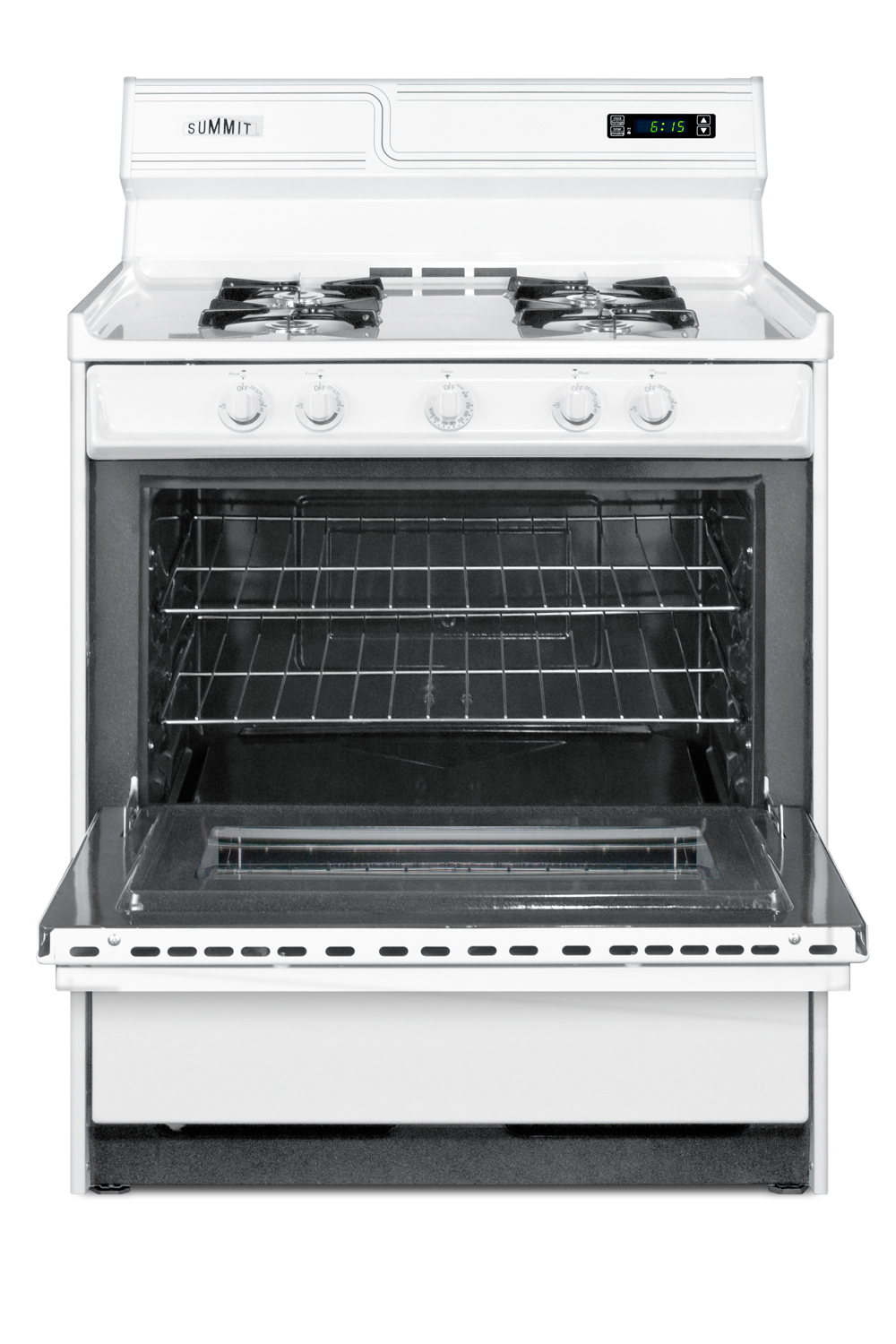 Summit Appliance offers a wide selection of American-made household ranges built for long-lasting durability in space-challenged kitchens. The WNM2307KW is a gas range sized at 30" wide, with a generous 3.7 cu.ft oven interior that can accommodate large trays. Two adjustable oven racks are included. An oven window and on/off interior light allow you to easily keep watch over your cooking. The broiler is located below the oven in a drop-down compartment. Four open 9000 BTU gas burners accommodate most of your stovetop heating needs, with upfront push-to-turn knobs that let you adjust your cooking without reaching over hot burners. This unit utilizes an electronic ignition system for added safety.The WNM2307KW comes in a classic white finish, with a high backguard that includes a digital clock and timer. This unit has a recessed oven door and is conveniently sized at just 24" deep for a better fit in galley in L-shaped kitchens, where every inch counts. Constructed from porcelain and steel, the WNM2307KW offers lasting durability. We include an anti-tip bracket for added safety. With its classic style and quality construction, Summit's made in the USA cooking line offers reliable cooking for smaller homes. Additional choices are available in 20", 24", and 36" wide fits. This unit ships ready for natural gas connections. To use with propane, add the Kit LP.