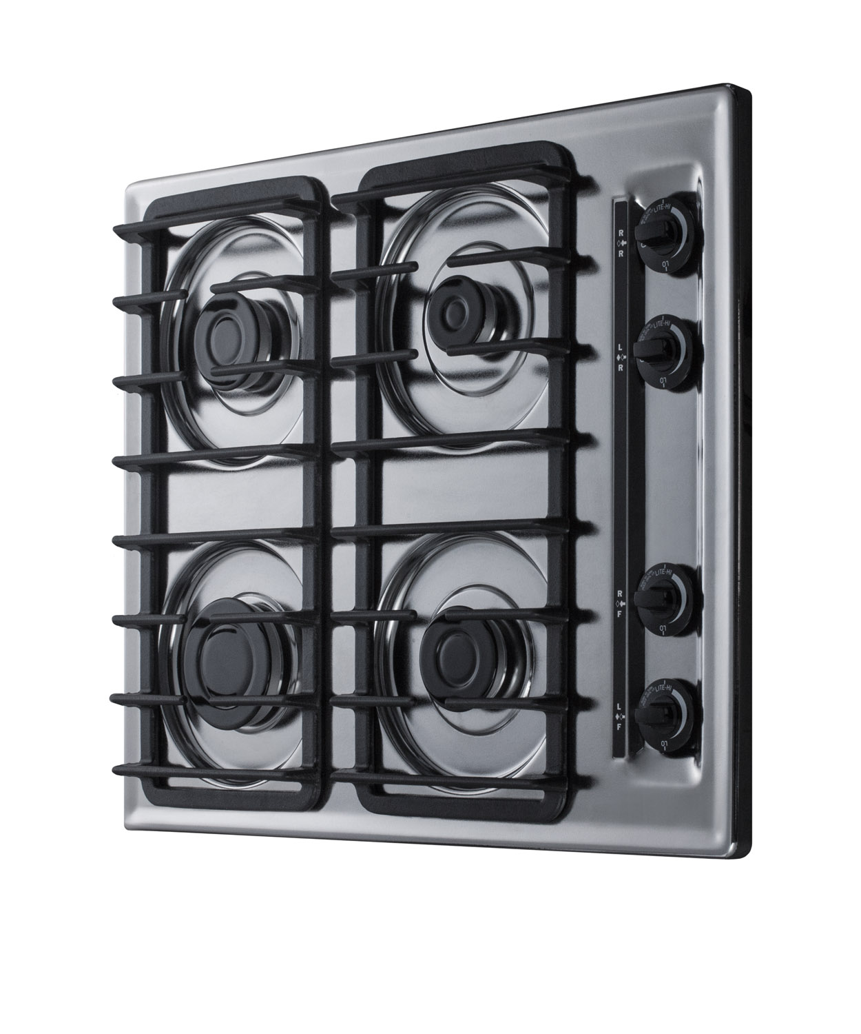 Made in the U.S.A., Summit's gas cooktops offer lasting quality and reliable cooking for smaller kitchen spaces.The ZTL033S is a 24" wide 4-burner cooktop designed for 22 5/8" W x 18 5/8" D cutouts. The brushed chrome surface features a recessed design to better contain spills. The side-located push-to-turn dial knobs offer easy use. Two sets of continuous cast iron grates are designed to hold up to heavy pots and pans. Four sealed Sabaf burners with removable burner caps ensure safer and cleaner cooking. The ZTL033S includes a high output 12000 BTU burner for powerful heating, conveniently located in front for easy access. The rear 5000 BTU burner is ideal for simmering at lower power or keeping food warm without overcooking. Two standard 9100 BTU burners meet most cooking needs. This unit utilizes electronic spark ignition and includes a pre-installed 3-pronged cord. The ZTL033S is set for natural gas and can be converted to propane connections with the purchase of our Kit LP S2. Additional choices are available in black and chrome.